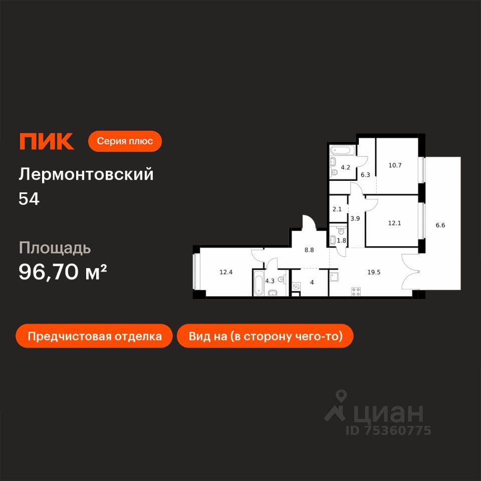 Продаётся 3-комн. квартира площадью 96,7 кв.м на 1 этаже 9 этажного дома (Корпус 1, Секция 6) проекта ПИК Лермонтовский 54. Светлый просторный подъезд на уровне земли, функциональная планировка, большие окна, предчистовая отделка.