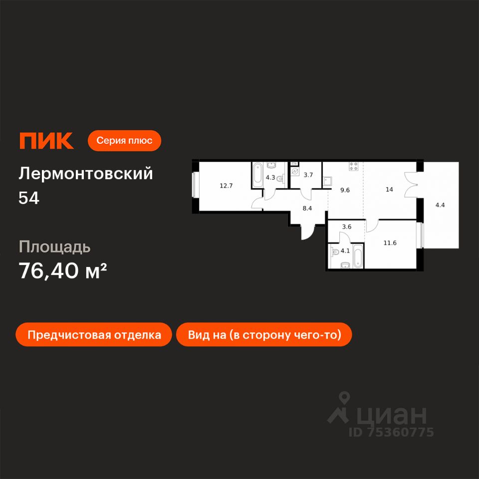 Продаётся 2-комн. квартира площадью 76,4 кв.м на 1 этаже 9 этажного дома (Корпус 1, Секция 6) проекта ПИК Лермонтовский 54. Светлый просторный подъезд на уровне земли, функциональная планировка, большие окна, предчистовая отделка.