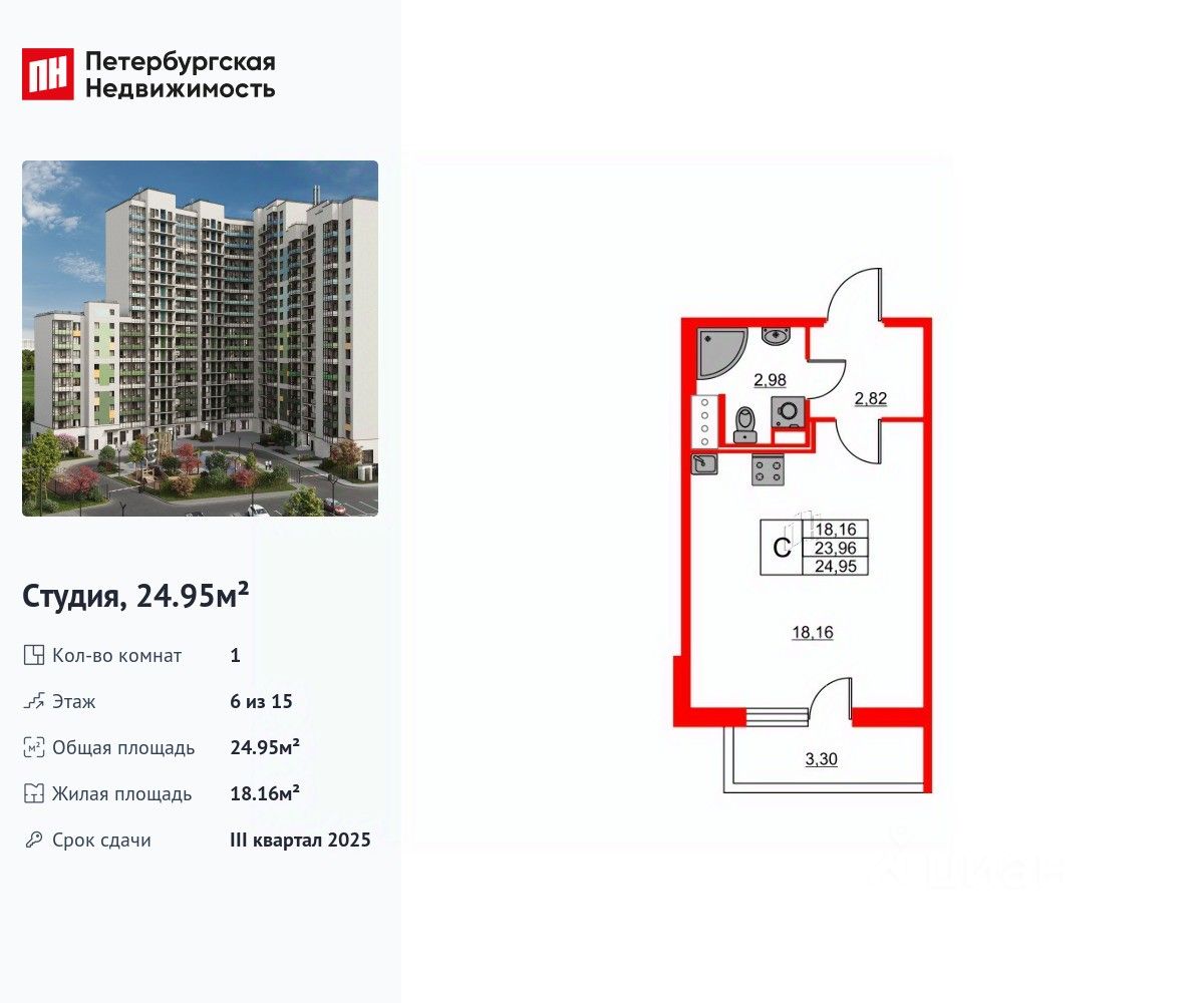 Удобная, классическая, функциональная европланировка, вместительная прихожая 2.82 м². Общая площадь студии - 24.95 м², жилая 18.16 м², высота потолка 2.73 м.