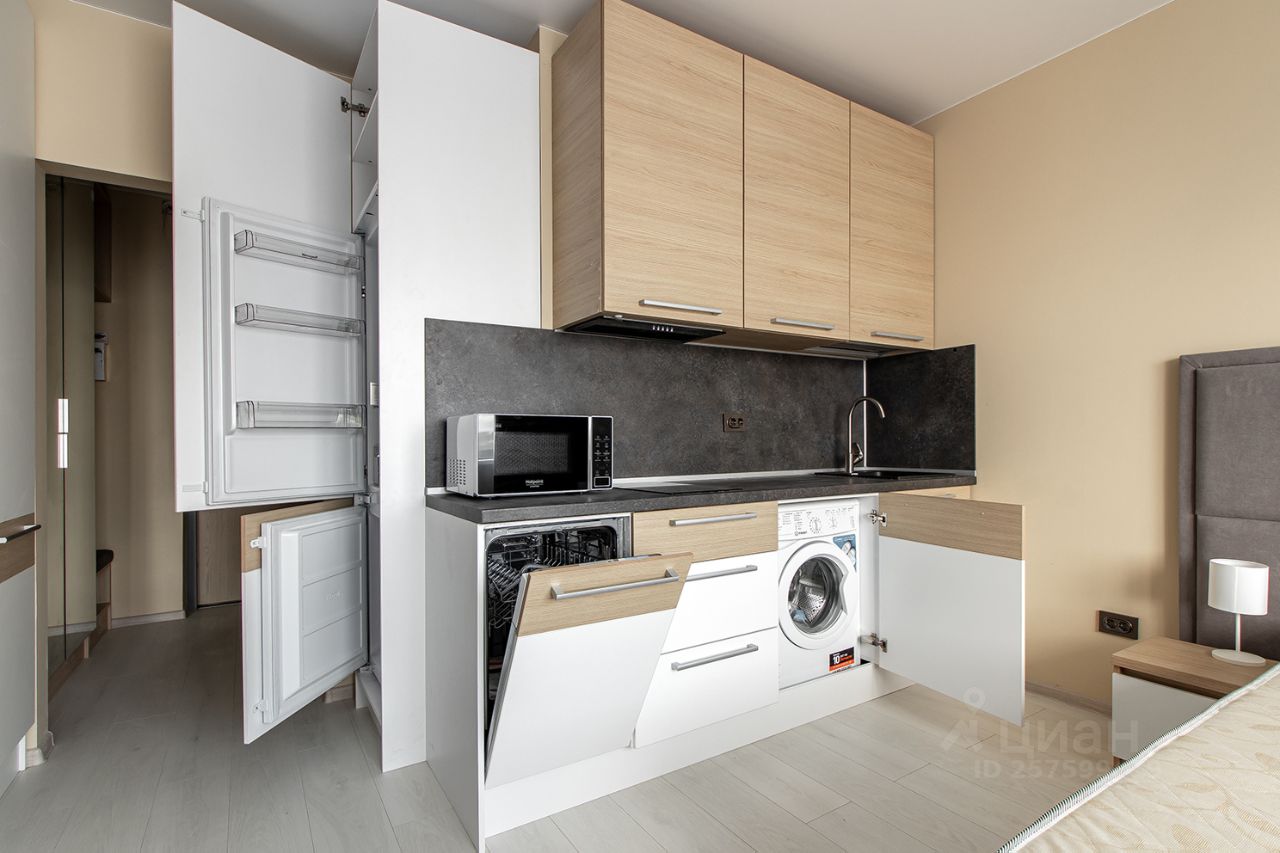 -Функциональная зона кухни с посудомоечной машиной, большим встроенным холодильником, микроволновкой и варочной панелью. На полу ламинат 32 класса,