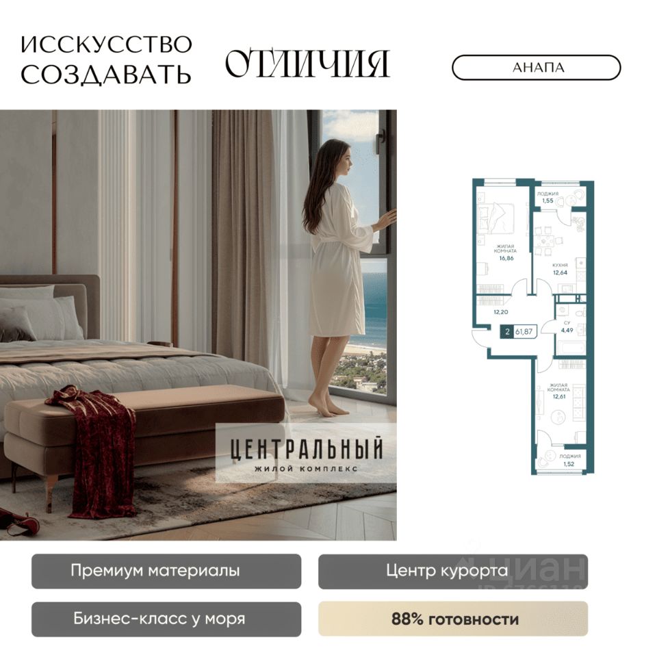 Жилой комплекс бизнес-класса ''Центральный'' в Анапе. Образец архитектурного искусства в центре курорта, для вашей респектабельной жизни у моря. Готов на 85%, сдаем уже в 2026 году! Для тех, кто ценит долговечность материалов, море в 10 минутах и шикарные виды без туристической суеты, кто привык к современному комфорту, и ценит время. Жить в комфорте, а не в пробках просто. Магазины сильных брендов, эстетика натурального камня в торговой галерее прямо в доме. Красивый шоппинг и новая точка притяжения в городе ЖК бизнес-класса ''Центральный''. Кафе, пекарни, а также большой развлекательный центр для детей и своя частная гимназия. Натуральные материалы в отделке фасада и во дворе. Фасад из натурального мрамора выделяет дом на фоне остальных мозаикой из 4 песчаных оттенков. Камень прекрасен сам по себе, что в доказательствах не нуждается, ведь прослужит долгие годы и сохранит дом на целые поколения. Приватный двор с гранитными пешеходными дорожками и озеленением с более чем 50 видами деревьев и растений. Современные детские и спортивные площадки, зона отдыха с фонтаном и ароматным садом пряный трав. Релакс после насыщенного дня дома, в окружении пышной зелени, водным охлаждением в жару и в безопасности: ведь двор закрыт, и как дом, лифты и паркинг под наблюдением видеокамер 24/7. Лифты скоростные и бесшумные, оснащены оборудованием для стабильного сигнала мобильной связи, удобно доставят вас от двери квартиры в подземный паркинг. VIP-клиентам премиум квартиры в панорамной башне (квартиры закрыты к продаже, по согласованию с менеджером обсуждается персональная стоимость) Премиум предложения всего две квартиры на этаже общей площадью 130 м2. Индивидуальные лифты с доступном в паркинг, панорамное остекление с защитой от ультрафиолета, потрясающие виды на город и горы, в перспективе на Храм. Красивая жизнь в центре курорта в достойном окружении уже ждет! До новой квартиры у моря один звонок. Застройщик ''Гамма'': 8 ЖК в Анапе сдано точно в срок, славимся постоянными покупателями. Предоставим условия покупки, выгодные именно вам: рассрочка, ипотечные программы по сниженным ставкам и увеличенной суммой ипотеки.