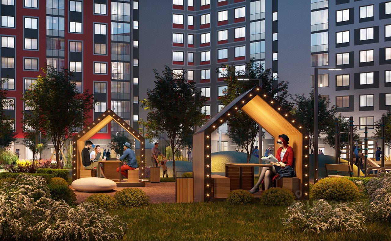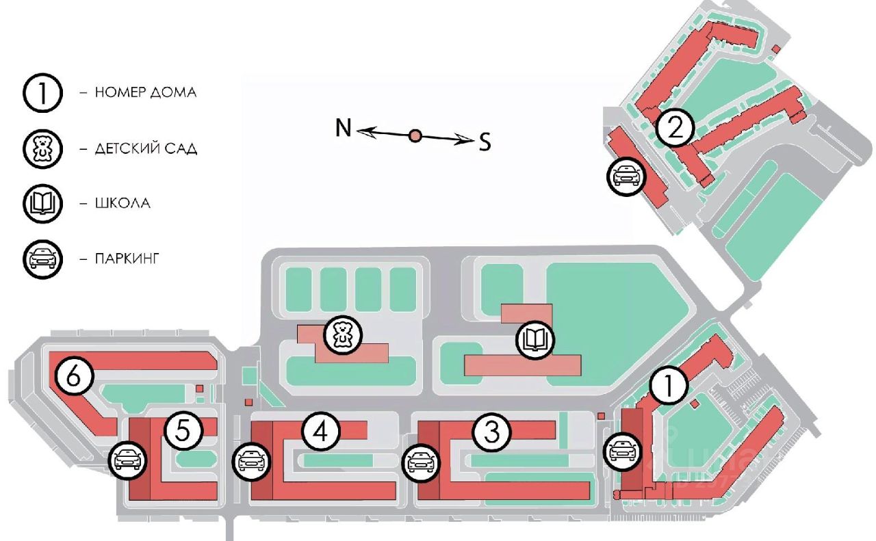 Закрытый двор на 6 домов, в комплексе предусмотрены детский сад и школа. Во дворе предусмотрены спортивные площадки, места для досуга соседей.