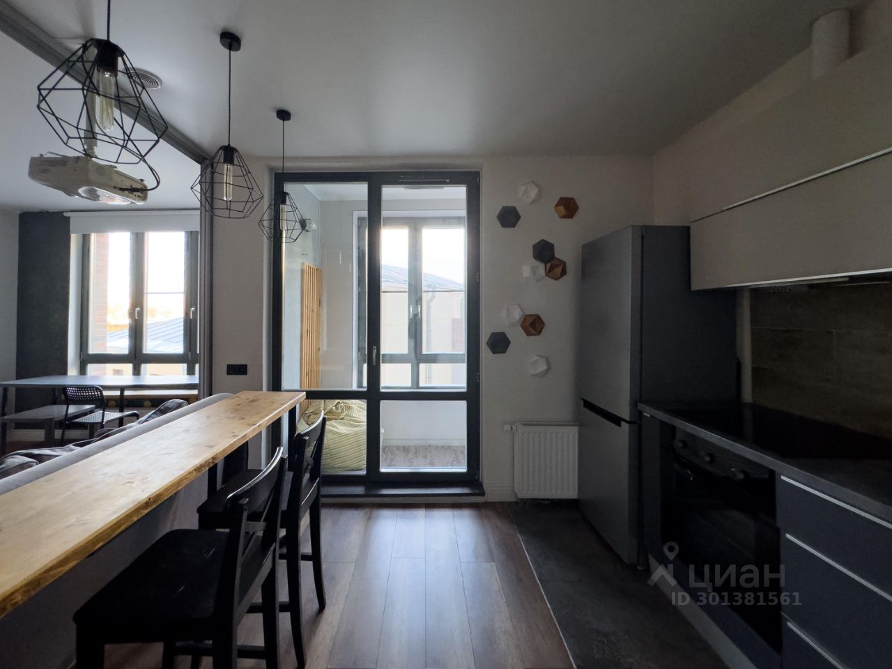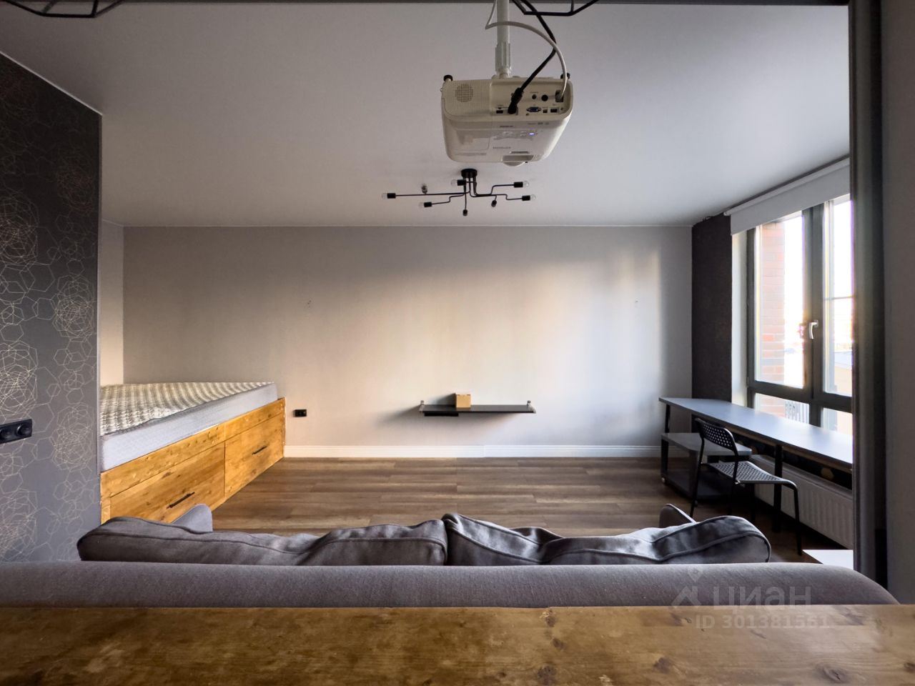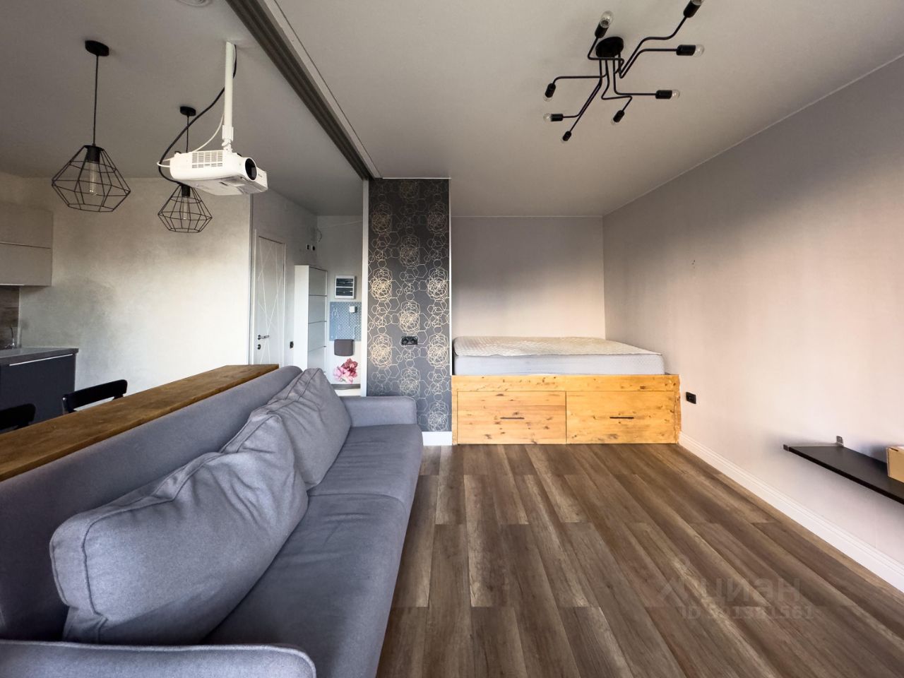 1. Небольшая прихожая с открытой системой хранения, зеркалом в пол и стеллажом для обуви, проведен интернет. 2. Совмещенный санузел с ванной, небольшой стиральной машиной, есть зеркало с хорошим светом и достаточно мест хранения. 3. Кухня с полноценным кухонным гарнитуром, установлен духовой шкаф и посудомоечная машина 45 см, холодильник, варочная панель и вытяжка. Функцию стола несет деревянная барная стойка со стульями, над которой висит проектор Epson. 4. Уютная лоджия с пуфиком и оборудованной нишей для хранения, окна выходят в тихий двор! 5. Гостиная комната с комфортным диваном и пустой стеной для проектора, пространство зонировано на рабочую зону и зону спальни в нише, да это такая высокая кровать, внизу спрятаны места хранения.