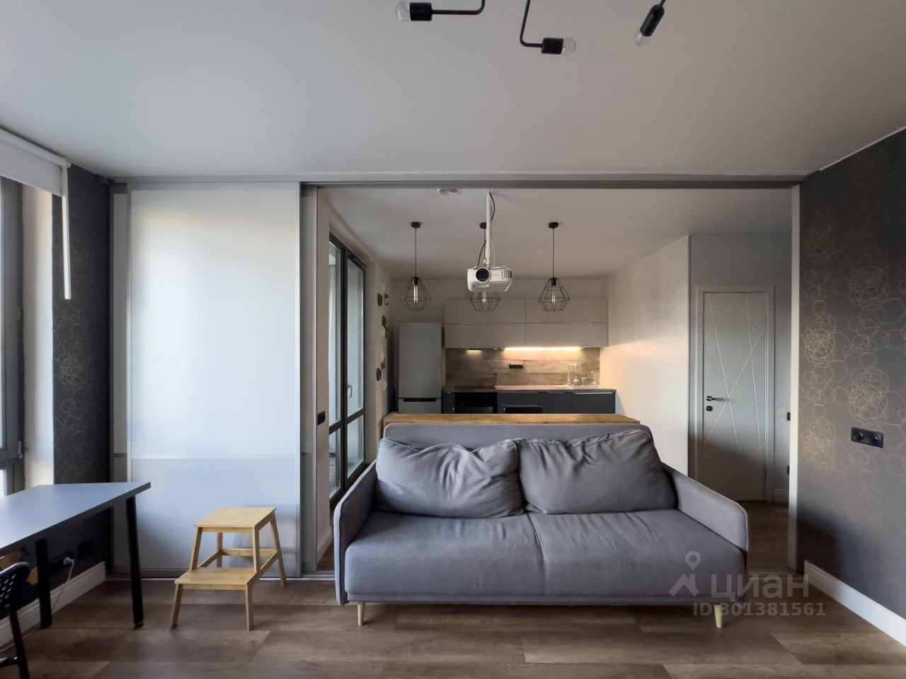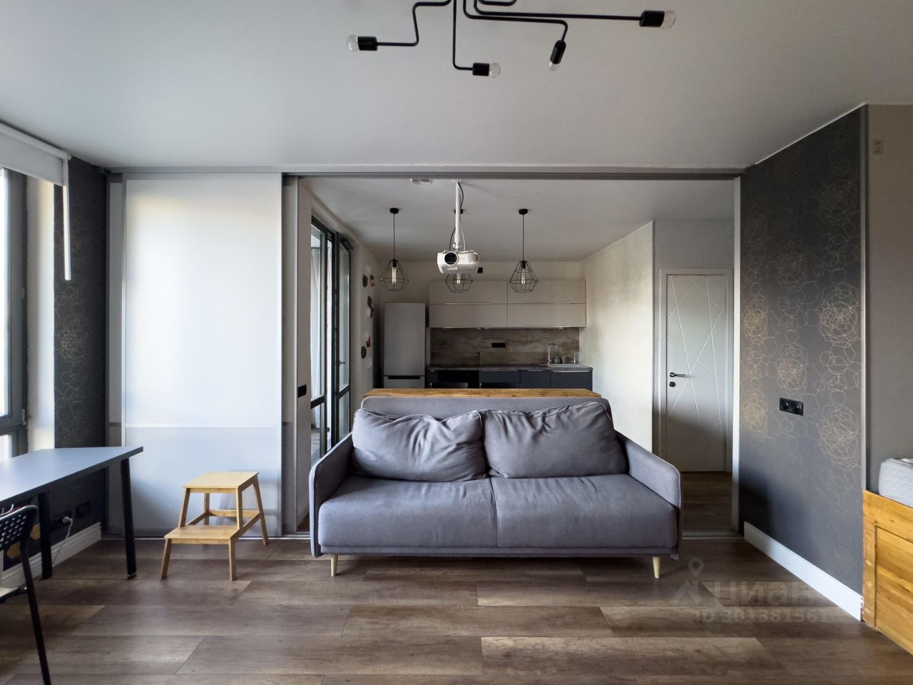 Квартира изначально была однокомнатная, но переделана в студию, есть выдвижные двери, которыми можно разделить пространство обратно, далее о планировке и наполнении: