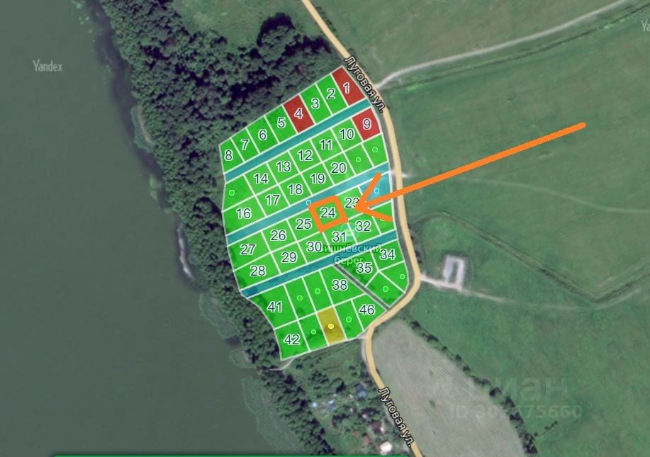 Продается живописный участок ИЖС 10 соток в поселке на берегу озера Вишнёвское (24 на схеме).