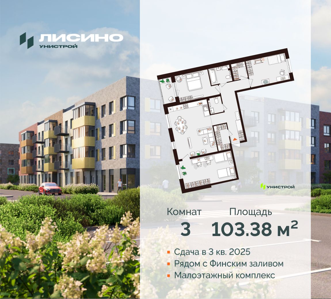 Лисино ''Лисино'' город-парк в Курортном районе Санкт-Петербурга от компании ''Унистрой''. Рядом Финский залив, экопарк, озеро, а также самый высокий небоскреб в Европе. Комплекс отличает чистый воздух, малоэтажная застройка, фасады из клинкерной плитки, уютные дворы, прогулочный бульвар, парковые зоны. Представлено разнообразие планировок: от студий, до двухуровневых квартир. Живите там, где другие отдыхают Город-парк ''Лисино'' находится в Курортном районе Санкт-Петербурга, в 15 минутах езды по Приморскому шоссе от станции метро ''Беговая''. Рядом Финский залив с благоустроенным пляжем, экопарк, озеро Сестрорецкий разлив и ''Лахта Центр''. Локация славится морским воздухом и хвойными лесами.