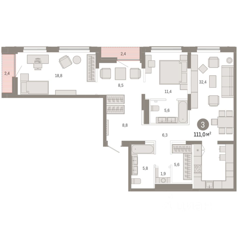 Квартира с кухней-гостиной и тремя спальнями в Октябрьском на Туре. Особенности планировки: лоджия, мастер-спальня, постирочная, свободная планировка. квартиры в нашей базе: ОКТ-08-6-6.5.8.
