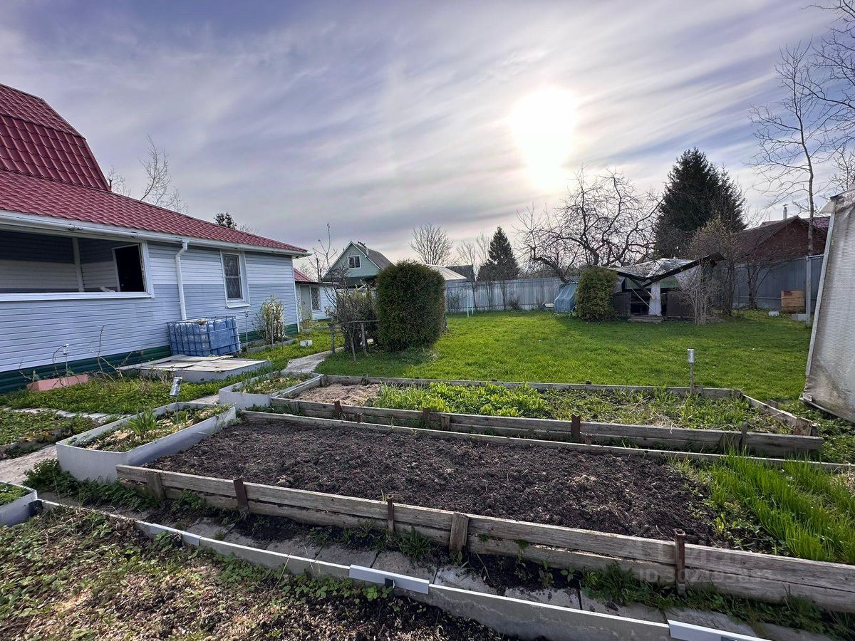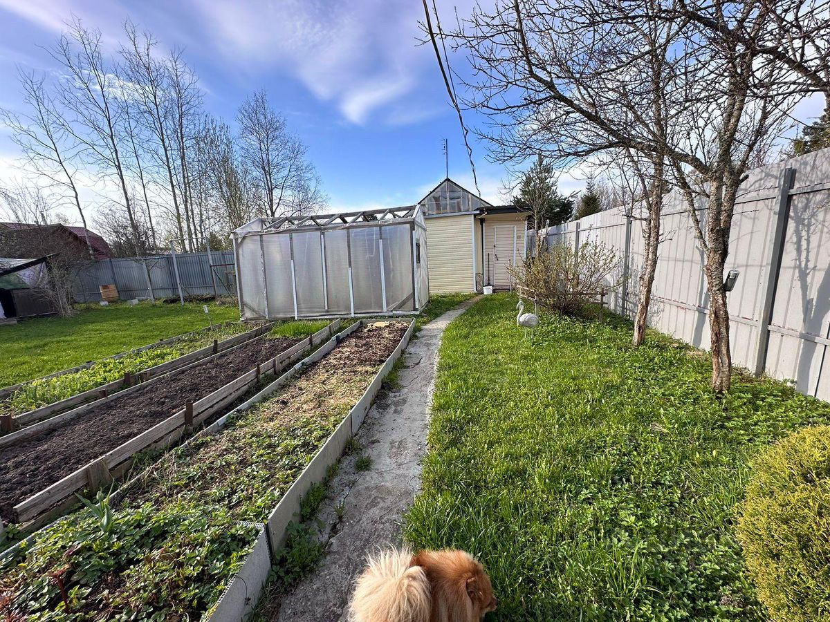 Участок площадью 7,5 соток огорожен забором. Ровный, сухой, ухожен. Посадки: яблони, вишня, малина, крыжовник, калина. Два парника, сарай и беседка на участке. Сделано межевание. Скважина.