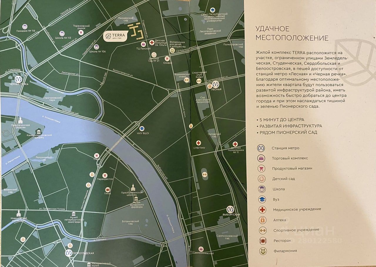 Впервые сдаётся стильная и уютная квартира в ЖК Terra. Станции метро Черная речка и Лесная в пешей доступности. В 500 метрах от комплекса ж/д станция Ланская. 10 минут на электричке до Финляндского вокзала. В пешей доступности набережная Черной речки и набережная Невы. В доме магазин Магнит и Магнит косметик, а также уютная кофейня.