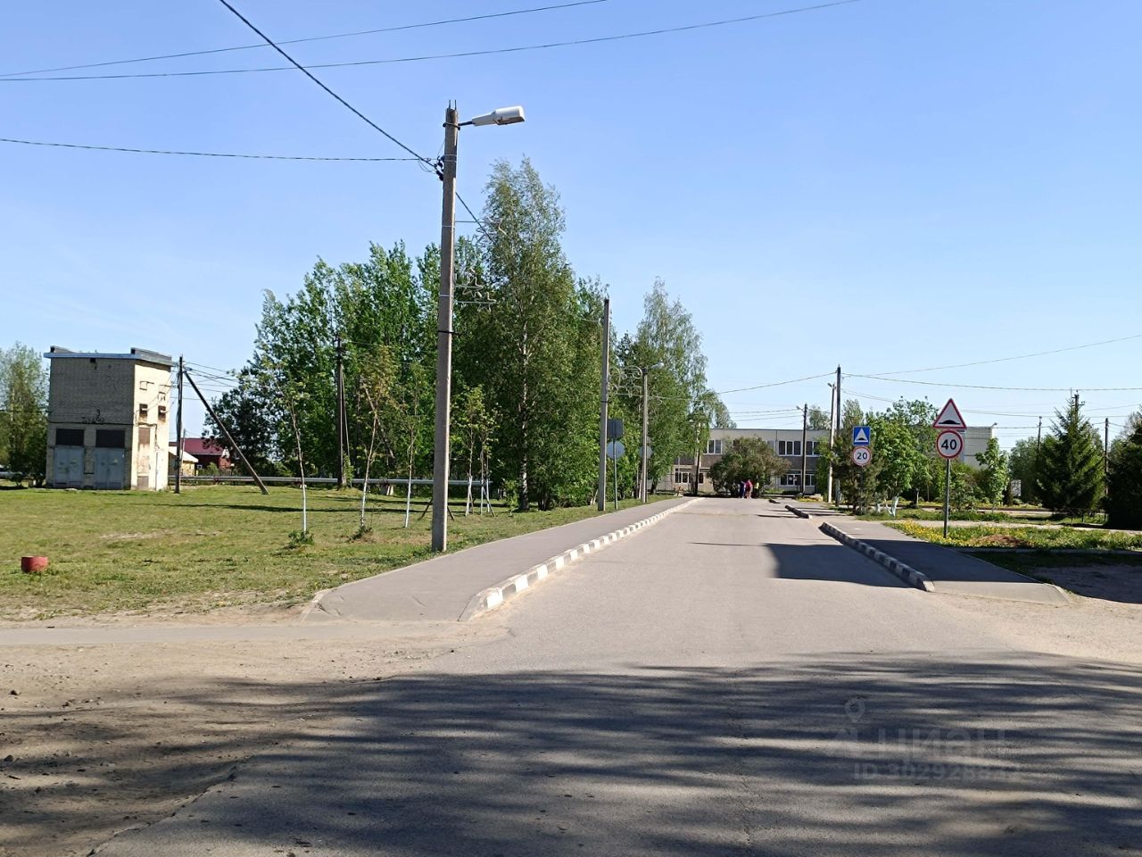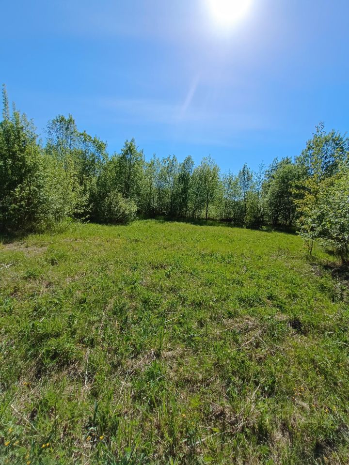 Прямоугольный ровный, сухой. Асфальт до участка, от асфальта до участка 30 метров, между дорогой и участком деревья.