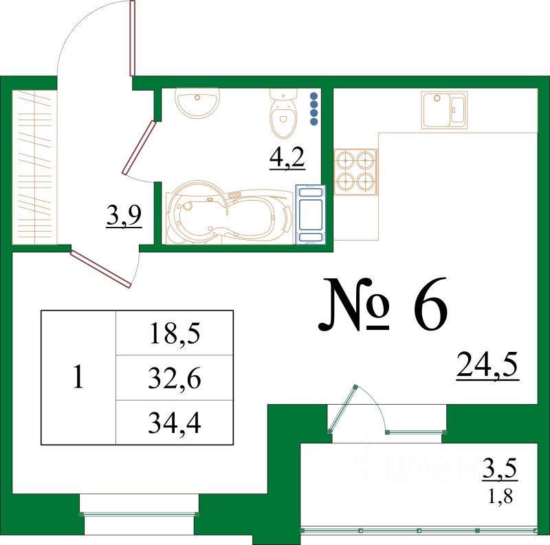 Продаётся студия в строящемся доме (Корпус 6), срок сдачи: II-кв. 2025, общей площадью 34.4 кв.м., на 4 этаже. Ленинградская область, Гатчина, Красносельское шоссе