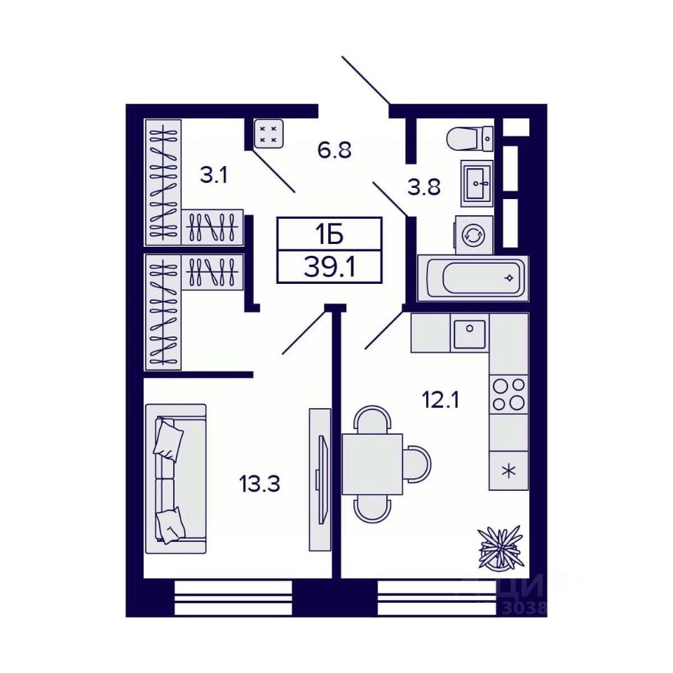 Общая площадь39,1 м2