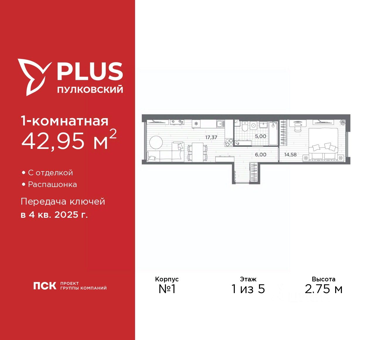 Просторная 1-комн. квартира с отделкой в ЖК ''PLUS Пулковский'' на 1 этаже. Общая площадь: 42.95 кв.м., жилая: 14.58 кв.м., площадь просторной кухни-столовой: 17.37 кв.м. Квартира - распашонка, без проходных комнат, окна выходят на paзные стороны дома. В квартире один совмещенный санузел. Высота потолков 2.75 м.