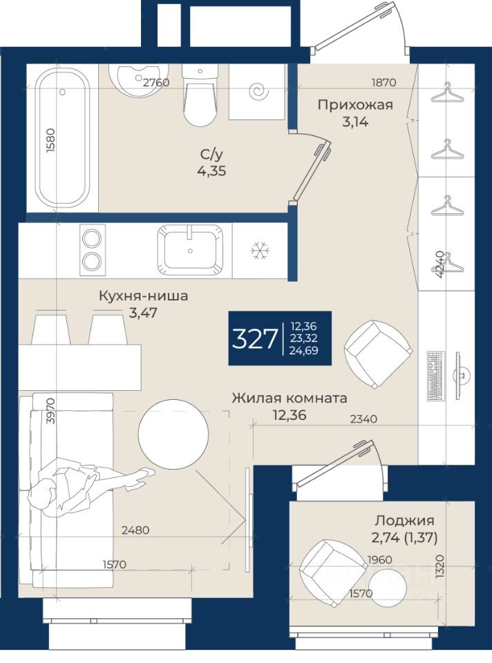 Жилой комплекс ''Новатория'', 1 очередь строительства, Корпус Б, Квартира 327 общей площадью 24,69 м2 на 8 этаже.ЖК ''Новатория'' —жилой комплекс комфорт-класса расположен в поселке Новоселье, в окружении леса и Шунгеровского заказника.