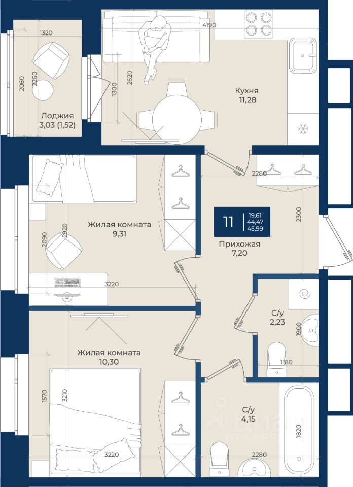 Жилой комплекс ''Новатория'', 1 очередь строительства, Корпус А, Квартира 11 общей площадью 45,99 м2 на 4 этаже.ЖК ''Новатория'' —жилой комплекс комфорт-класса расположен в поселке Новоселье, в окружении леса и Шунгеровского заказника.