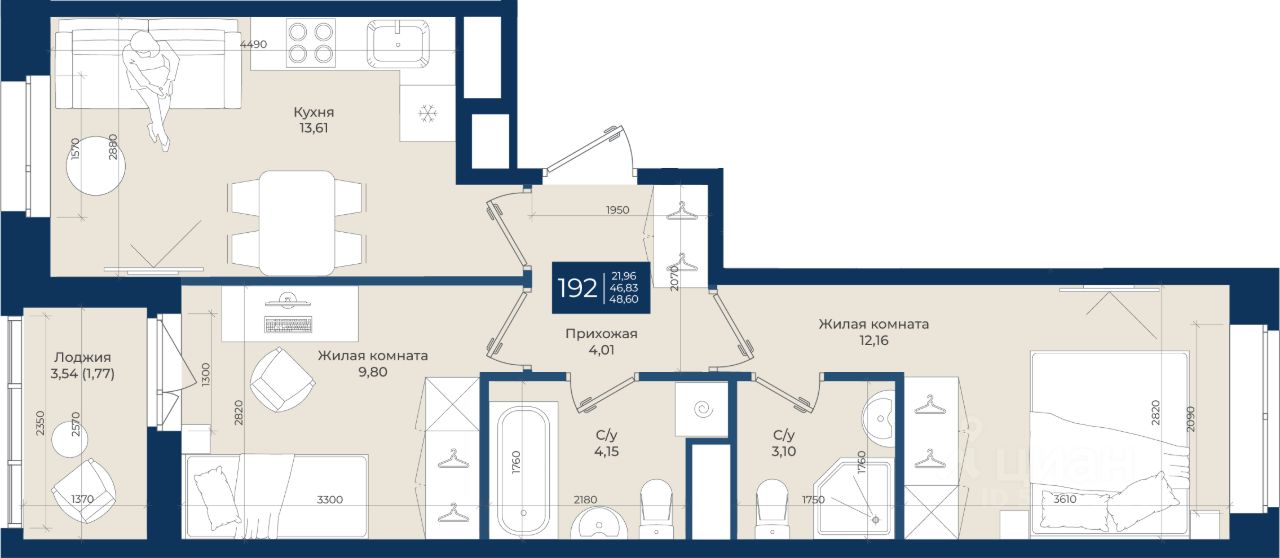 Жилой комплекс ''Новатория'', 1 очередь строительства, Корпус Б, Квартира 192 общей площадью 48,6 м2 на 8 этаже.ЖК ''Новатория'' —жилой комплекс комфорт-класса расположен в поселке Новоселье, в окружении леса и Шунгеровского заказника.