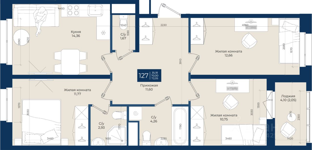 Общая площадь72,05 м2