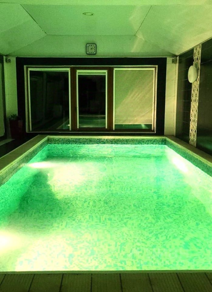 В банном комплексе расположены: крытый бассейн, финская сауна, комната отдыха, гостевая спальня с балконом и санузел.