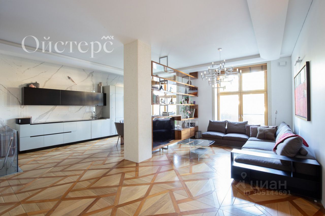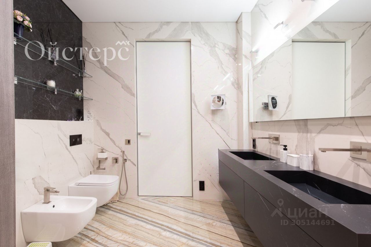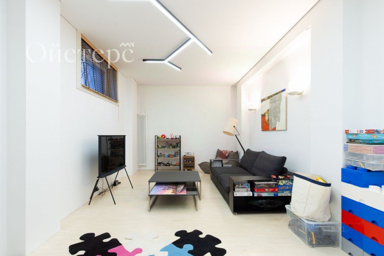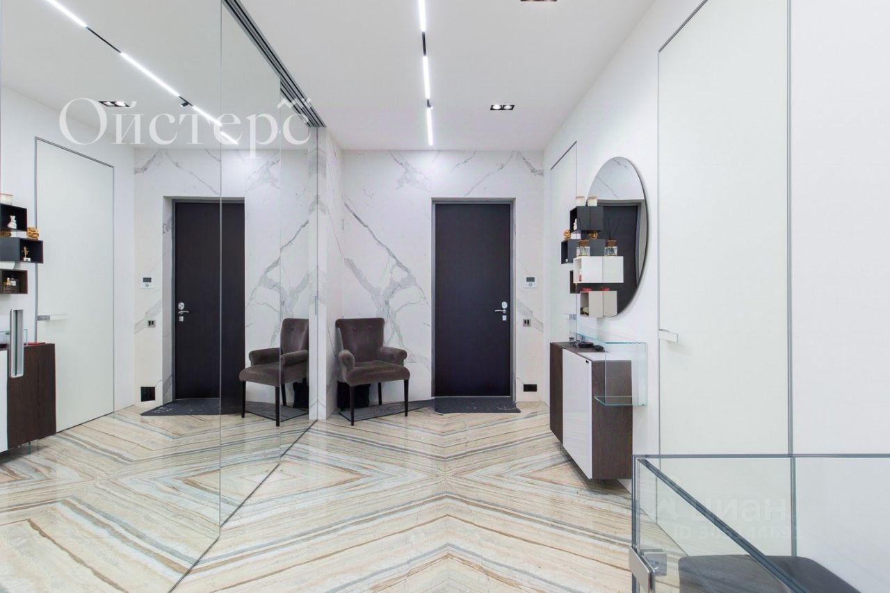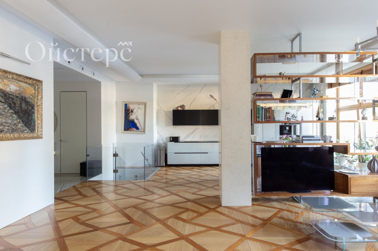 О квартире Квартира отличается современным дизайнерским ремонтом премиального уровня. Интерьер украшен наборным паркетом, натуральным камнем и дизайнерским светом. Продуманная и функциональная планировка включает в себя умный дом с множеством сценариев освещения, тёплые полы и управление затемнением окон. Также установлена система приточно-вытяжной вентиляции с кондиционированием. В квартире два уровня. На первом уровне расположены просторная кухня-гостиная, три спальни, гардеробные комнаты, хозяйственная комната и два санузла. Панорамные окна и напольные радиаторы отопления обеспечивают комфорт в любое время года. Нижний уровень квартиры площадью 34,5 кв. м может служить дополнительной спальней, игровой или местом для хобби и увлечений. Высота потолков составляет 3,4 метра. Вместе с квартирой предлагается место в подземном паркинге.