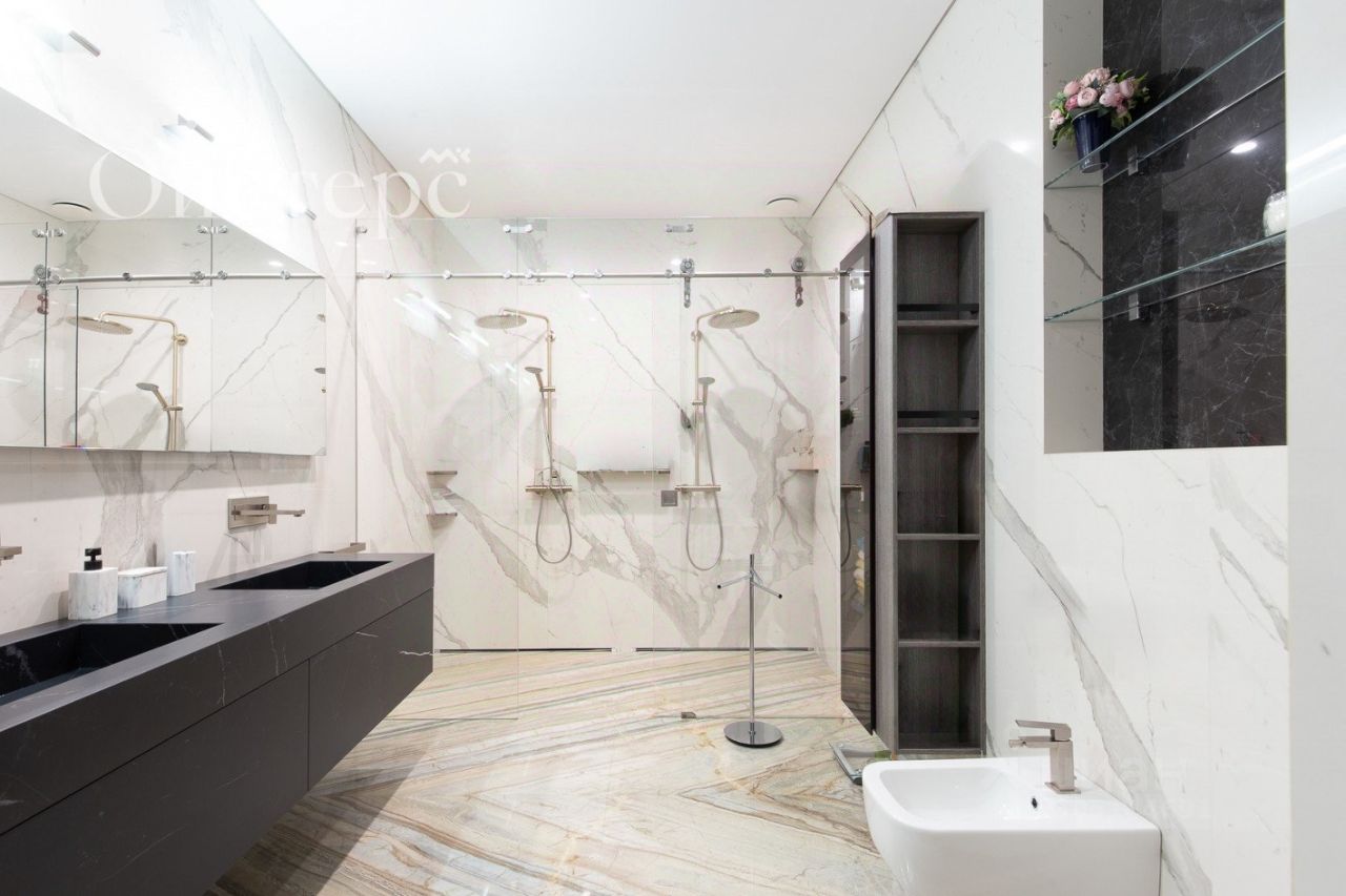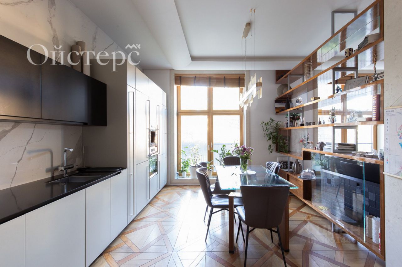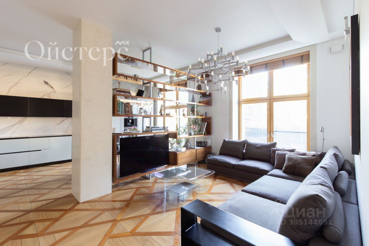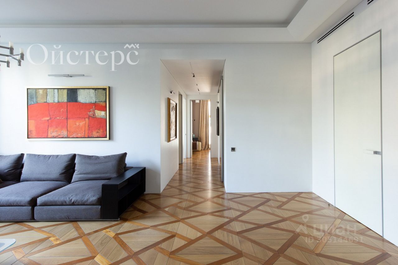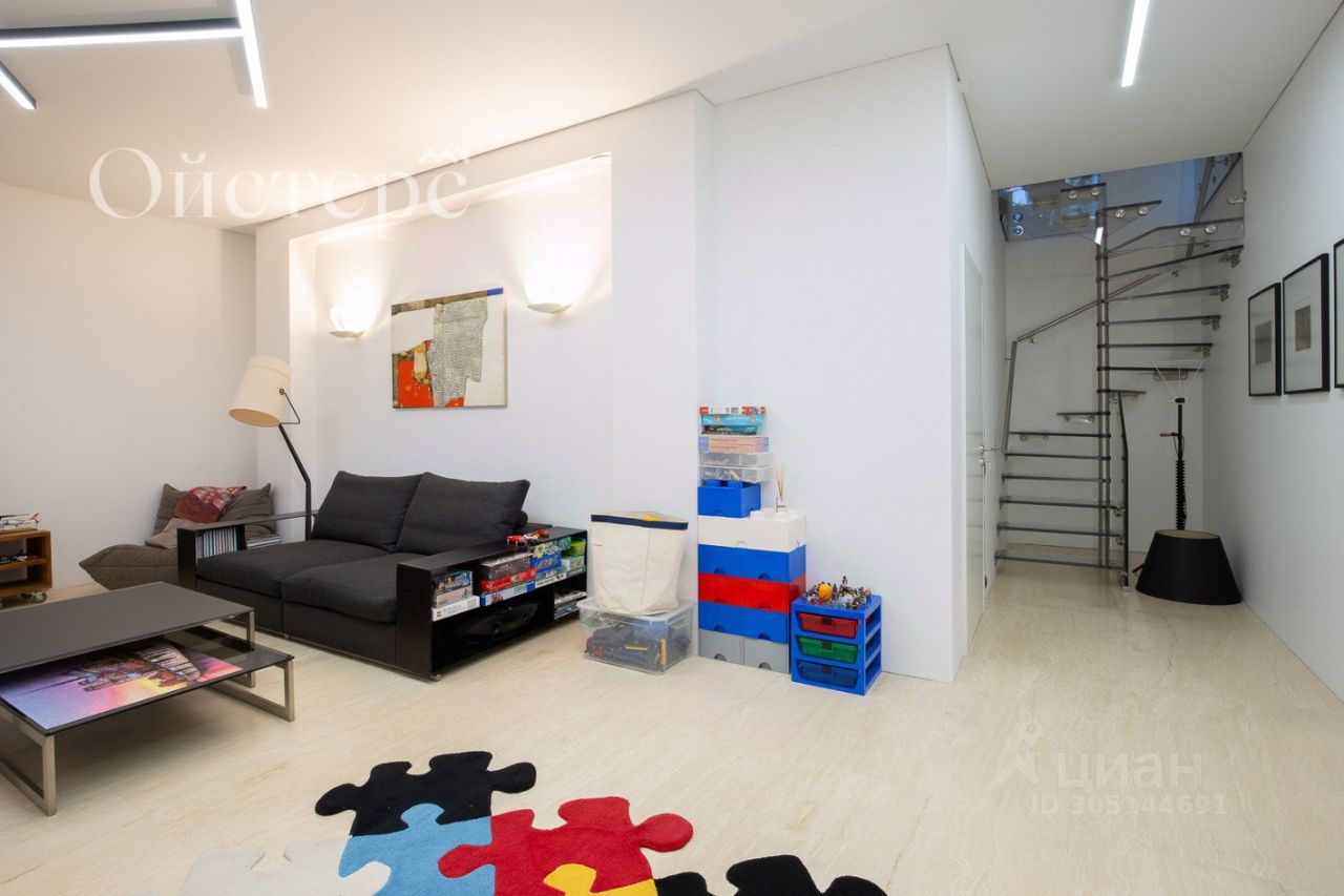 О квартире Квартира отличается современным дизайнерским ремонтом премиального уровня. Интерьер украшен наборным паркетом, натуральным камнем и дизайнерским светом. Продуманная и функциональная планировка включает в себя умный дом с множеством сценариев освещения, тёплые полы и управление затемнением окон. Также установлена система приточно-вытяжной вентиляции с кондиционированием. В квартире два уровня. На первом уровне расположены просторная кухня-гостиная, три спальни, гардеробные комнаты, хозяйственная комната и два санузла. Панорамные окна и напольные радиаторы отопления обеспечивают комфорт в любое время года. Нижний уровень квартиры площадью 34,5 кв. м может служить дополнительной спальней, игровой или местом для хобби и увлечений. Высота потолков составляет 3,4 метра. Вместе с квартирой предлагается место в подземном паркинге.