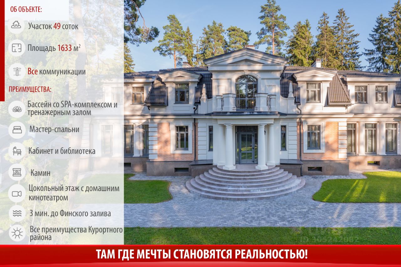 Этот шедевр 1633м2 расположен на участке 49 соток среди многолетних сосен и елей всего в 400м от Финского залива с песчаным пляжем. Поместье уникально и неповторимо! Оно расположено в самом престижной части Курортного района - пос. Солнечное.