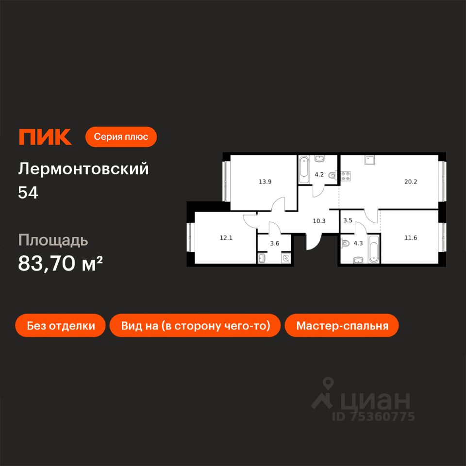 Продаётся 3-комн. квартира площадью 83,7 кв.м на 1 этаже 9 этажного дома (Корпус 2.2, Секция 11) проекта ПИК Лермонтовский 54. Светлый просторный подъезд на уровне земли, функциональная планировка, большие окна, без отделки.