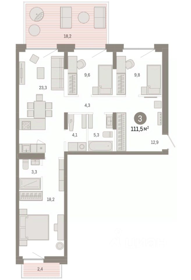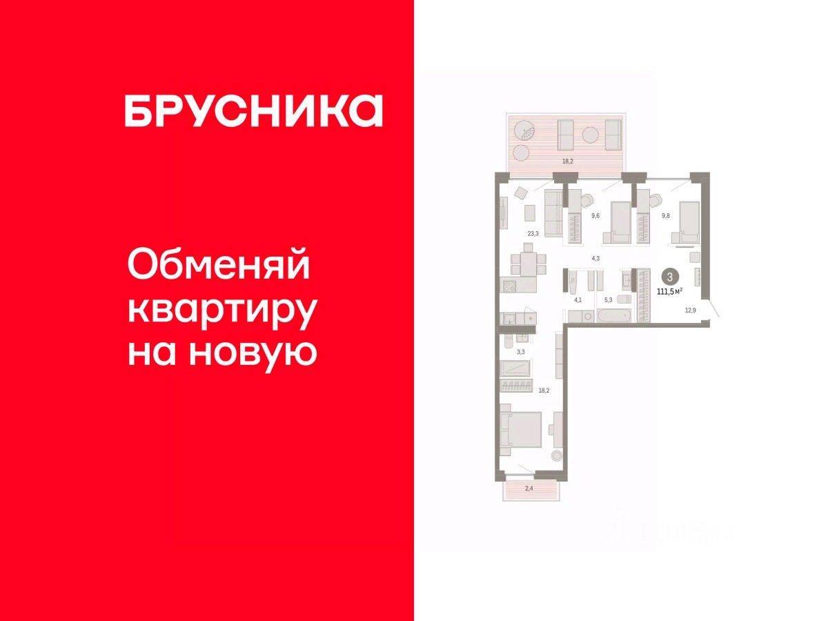 Квартира с кухней-гостиной и тремя спальнями в жилом районе ''Зарека''. Особенности планировки: мастер-спальня, постирочная, разнесённые спальни, свободная планировка, терраса. квартиры в нашей базе: ЗРК05.2-Ж5.2.3.