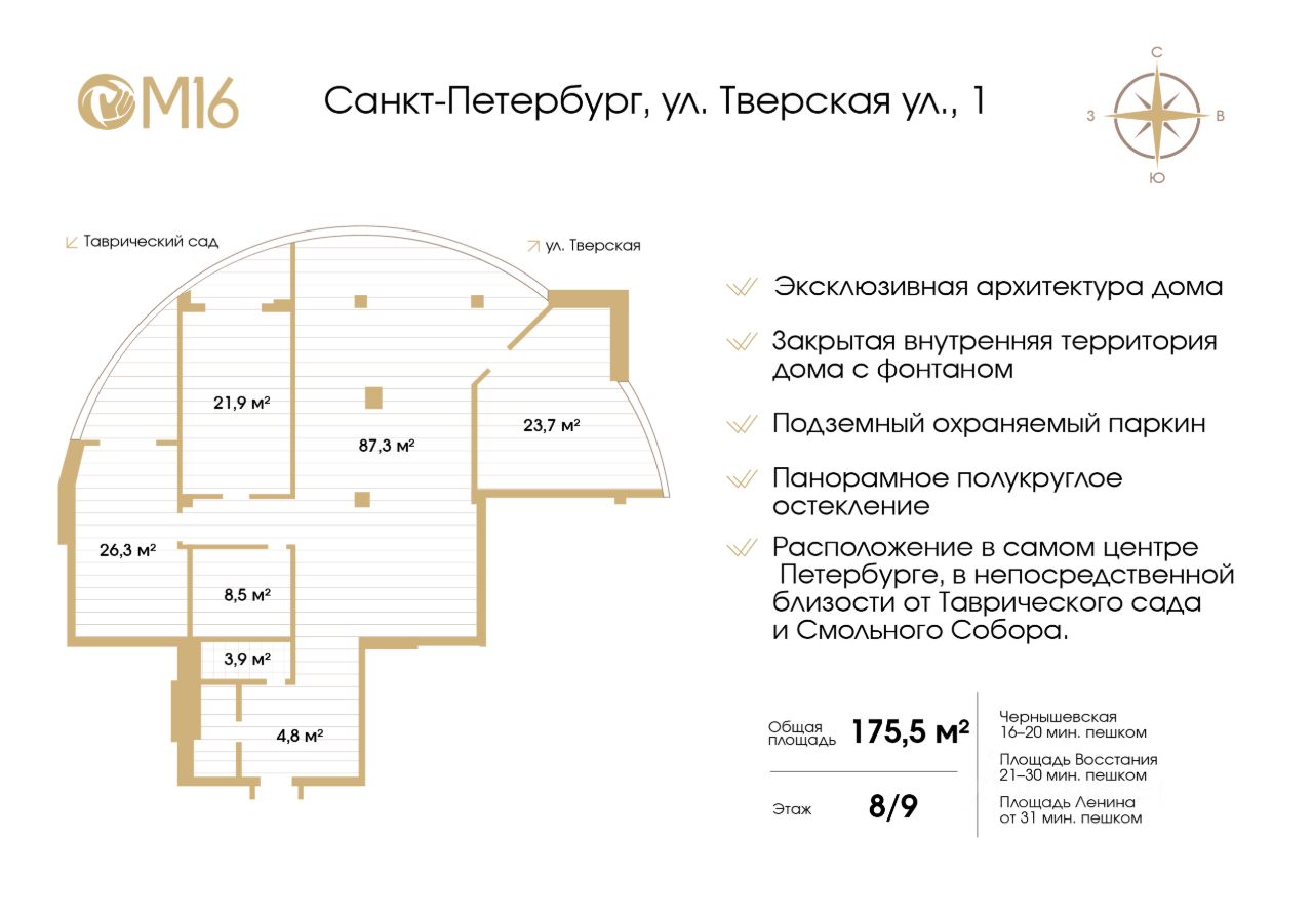 - Общая площадь — 175.5 м² - Кухня - столовая — 87.3 м² - Изолированные комнаты: 26.3 м², 21.9 м², 23.7 м² - Два санузла и гардеробная