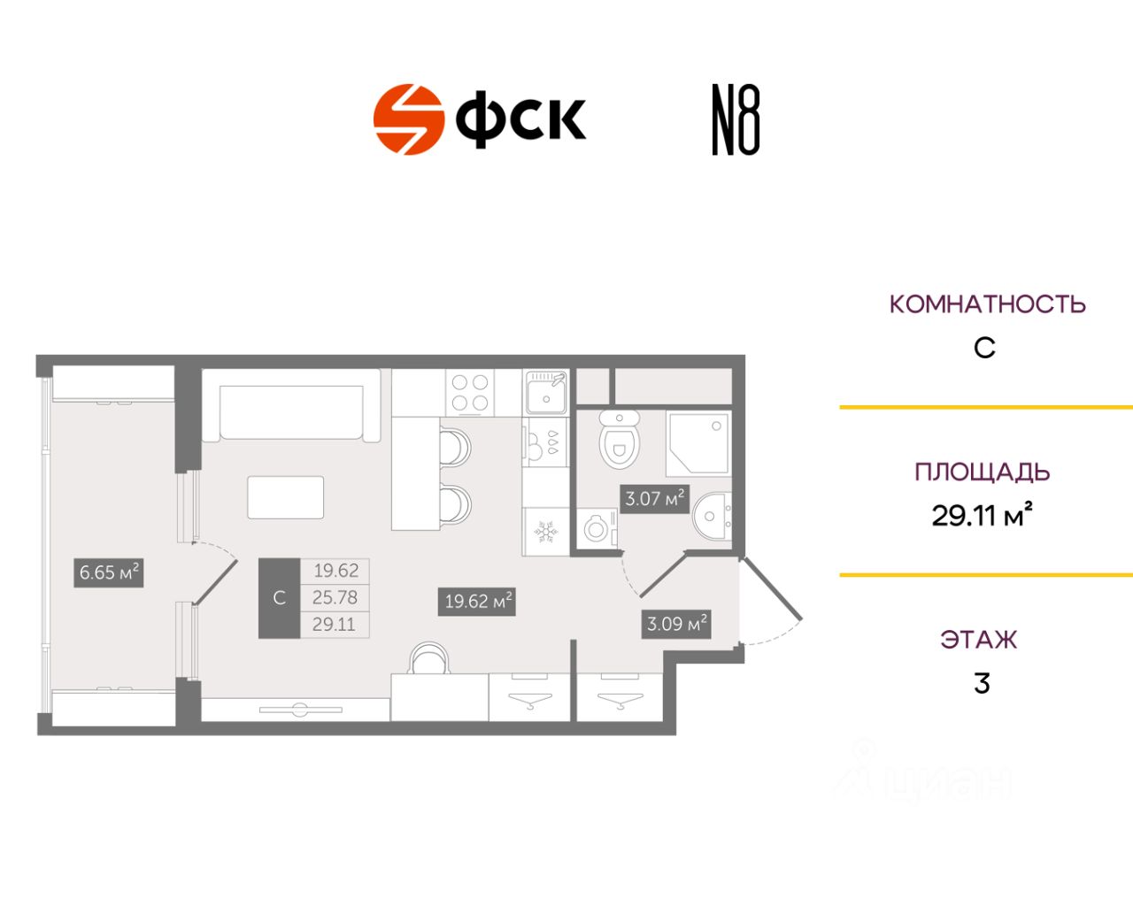 Прямая продажа от застройщика — только в этом месяце. Студия в клубном доме N8 на 3-м этаже. Общая площадь 29,11. Без отделки.