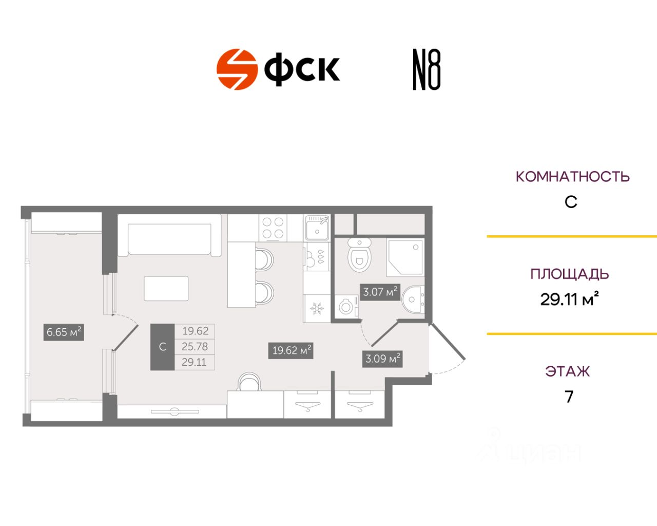 Прямая продажа от застройщика — только в этом месяце. Студия в клубном доме N8 на 7-м этаже. Общая площадь 29,11. Без отделки.