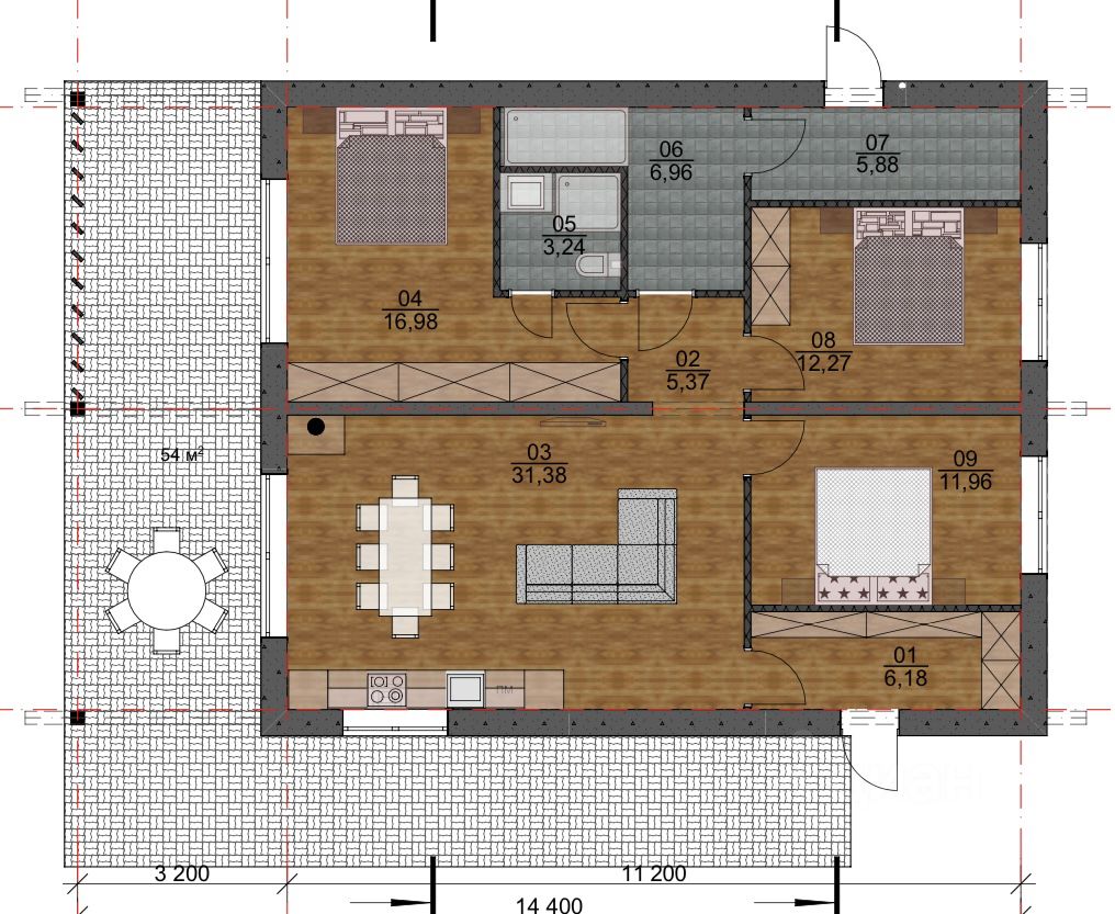 Дом с подрядом - площадь 120м, терасса - 60м, теплые полы