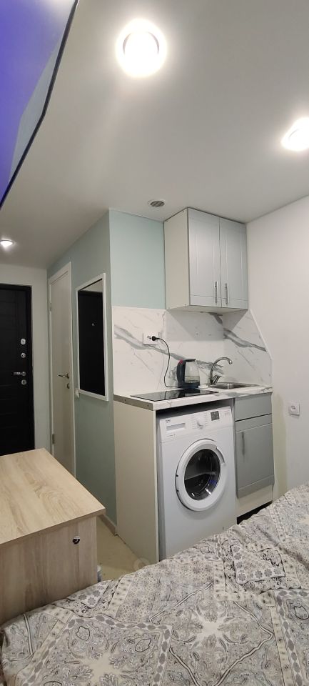 Встроенная кухня, стиральная машина, холодильник поменяли установили большой, э/чайник, кухонный гарнитур, микроволновку докупили, индукционная плита, вплоть до посуды.