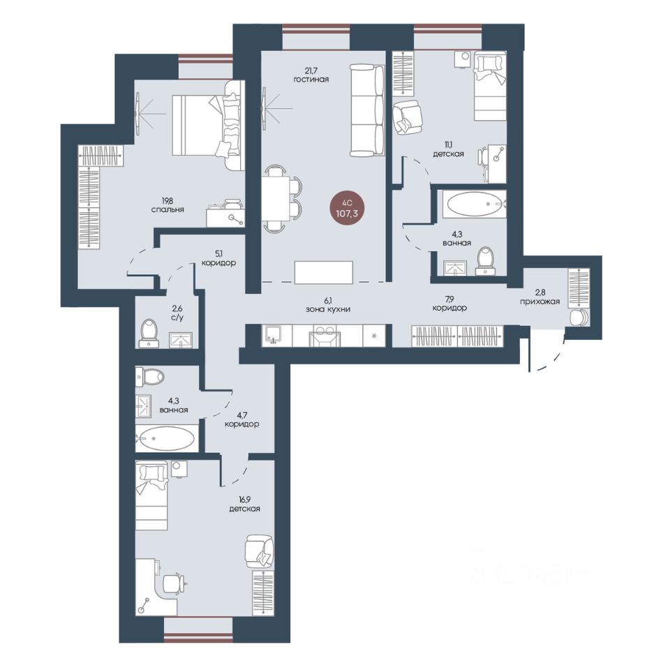 Продаётся 4-комнатная квартира в сданном доме (Корпус 1), срок сдачи: IV-кв. 2025, общей площадью 107.3 кв.м., на 1 этаже. Откройте мир комфорта и уюта с квартирами в ЖК ''Белозерский''!