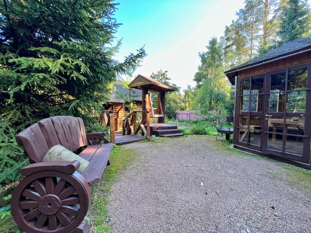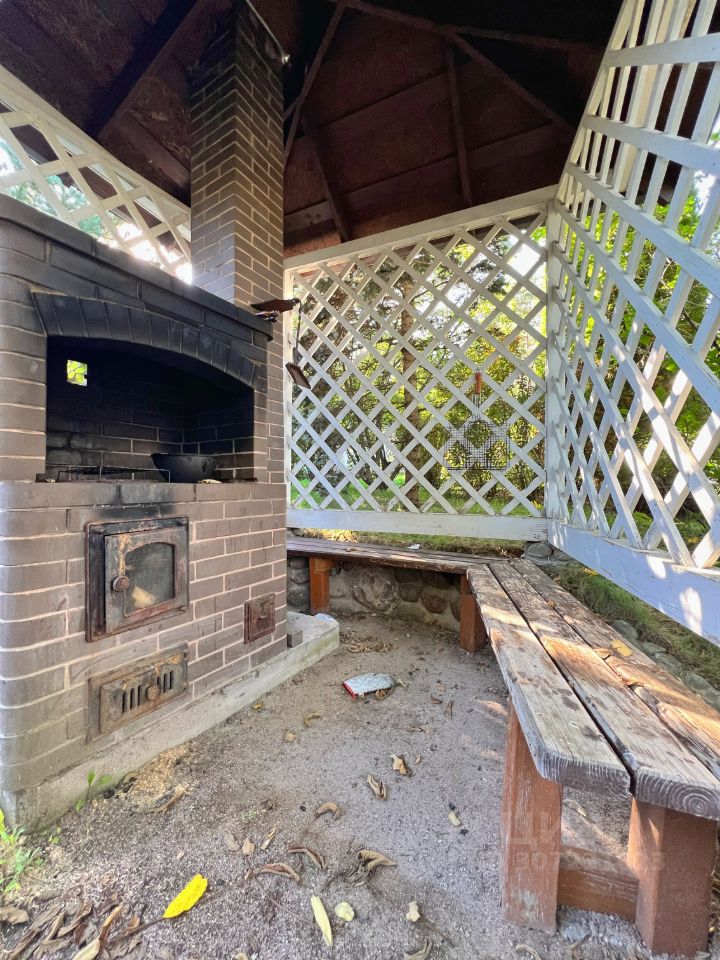 7) Закрытая лаунч-зона возле бани со скамейками и качелей на улице