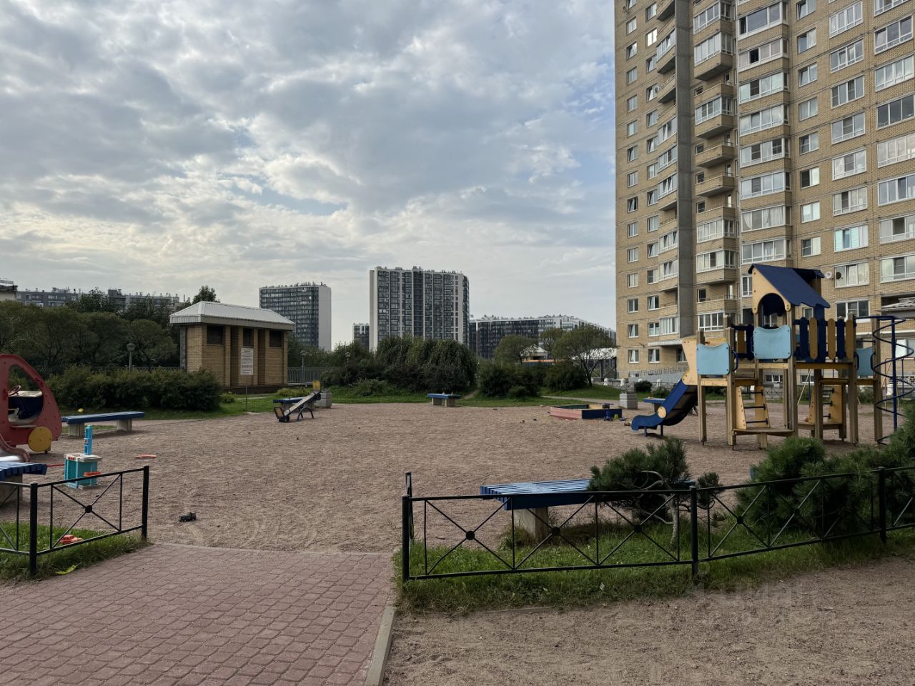 Территория комплекса огорожена, есть детская площадка, много зелени.