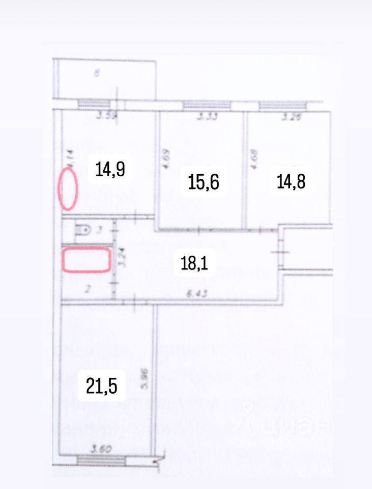 Кухня-гостинная 14,9м2 с лоджией и 3 отдельные комнаты 21,5м2 + 15,6м2 + 14,8м2.