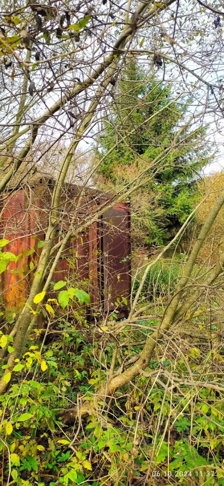 - Участок ровный, сухой, не разработанный, на нем находится старый контейнер, много декоративных деревьев и кустарников, большая ель, обнесен рабицей,