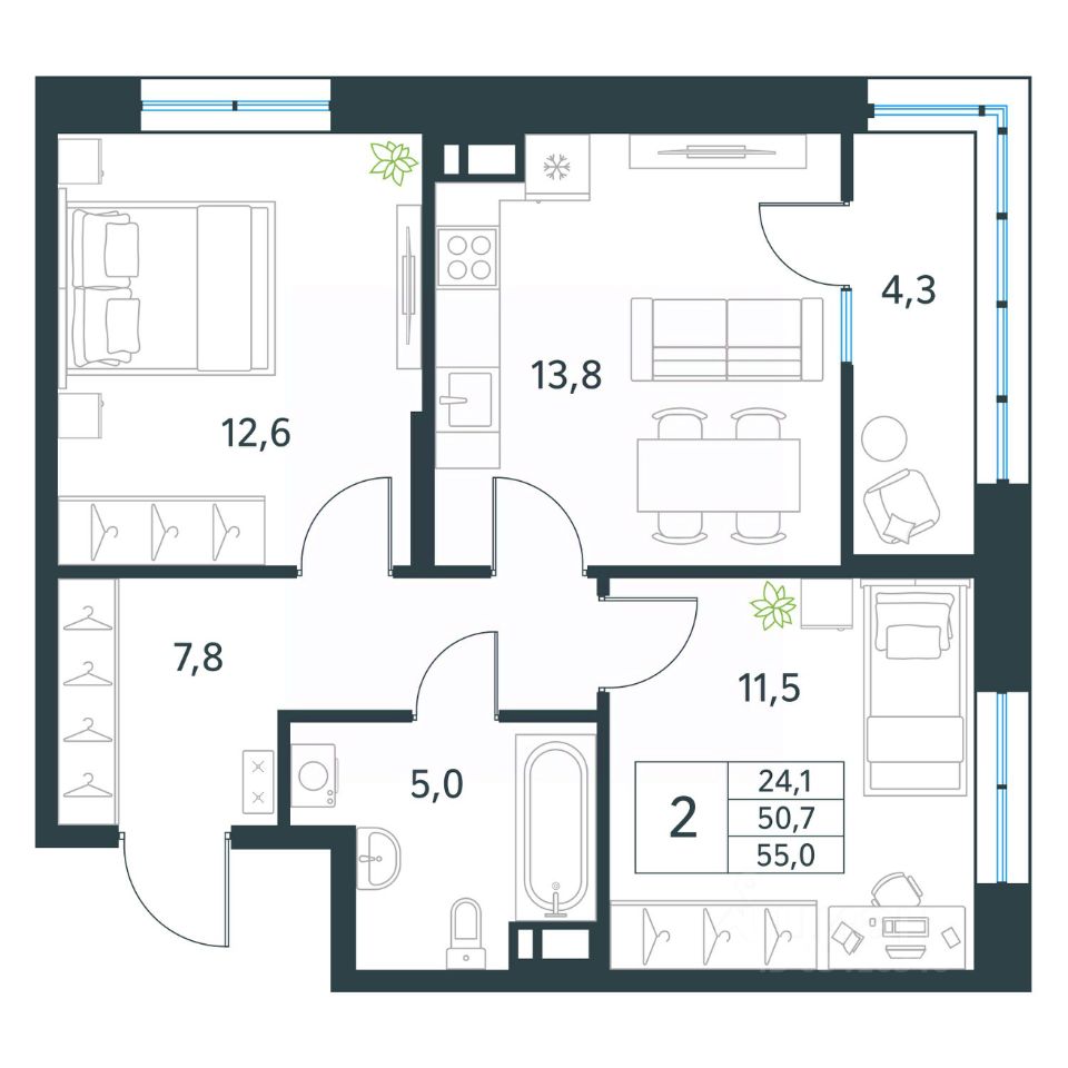 Продается 2-комн. квартира площадью 55 кв.м, без отделки. Квартира расположена на 16 этаже 18 этажного монолитного дома (Литер 1 (3 очередь), Секция 1) в ЖК ''Хороший'' от АТОЛЛ.
