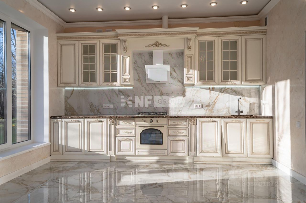Особняк построен по индивидуальному проекту , с применением качественных материалов, в отделке использованы бронзовые, латунные кованые элементы, натуральный камень, хрусталь, венецианская штукатурка, благородные породы дерева.