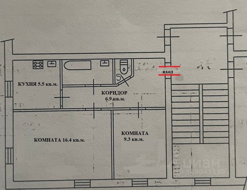 Продается двухкомнатная квартира в г. Шлиссельбург, Комсомольская 4, общей 42,0 кв.м. Комнаты 16.4 + 9.3 кв.м., кухня -5.5 кв.м., санузел раздельный, коридор 6.9 кв.м.