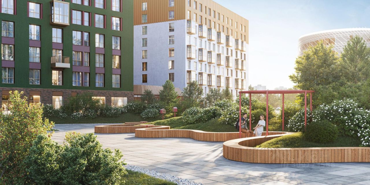 Занимайтесь йогой в воркаут-пространстве и бегайте по зеленому бульвару. Предусмотрели догхабы, площадь с амфитеатром и паркинги за пределами двора.