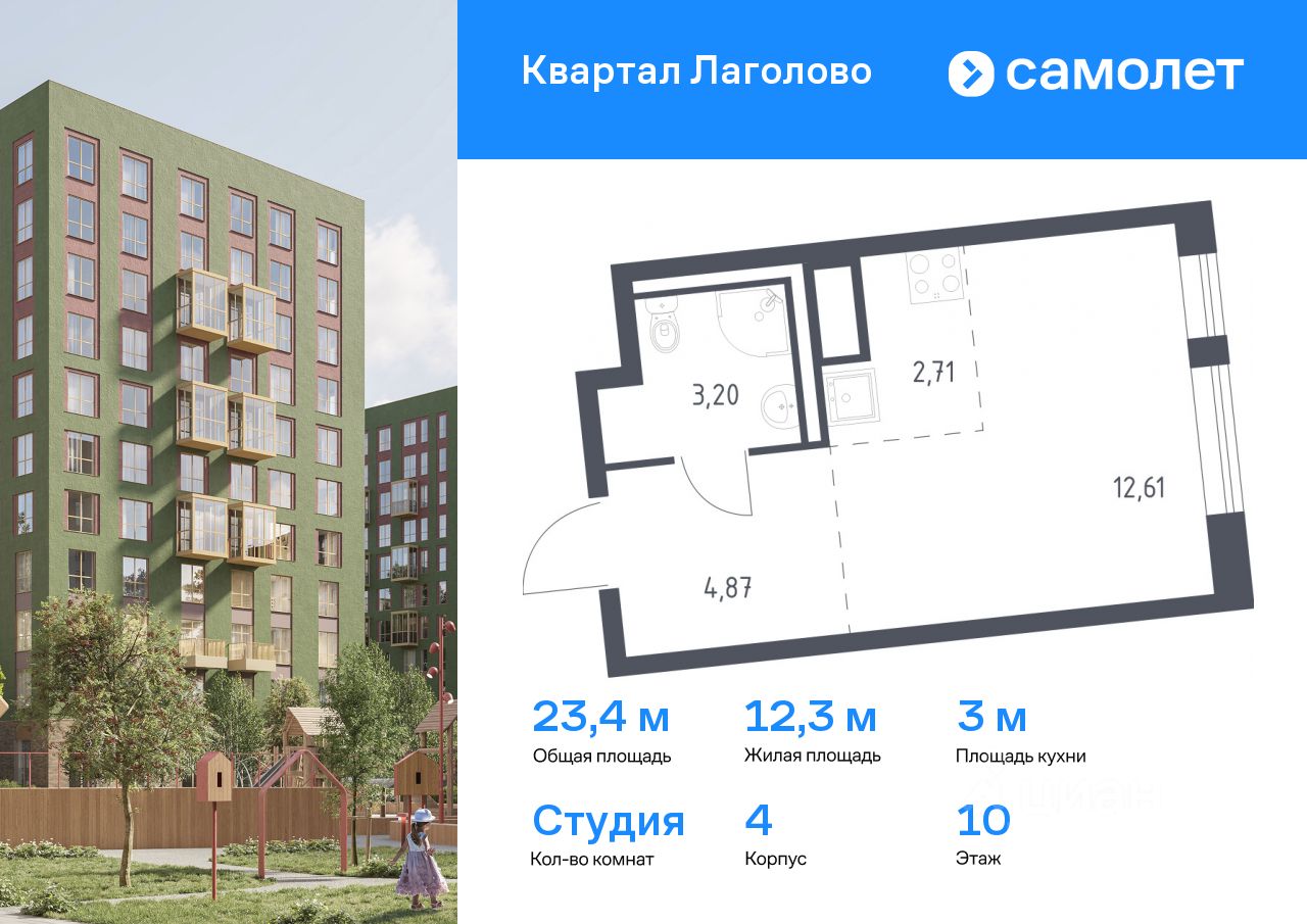 Предлагается квартира студия комфорт-класса 23,39 кв.м в корпусе 4 на 10 этаже, в ЖК ''Квартал Лаголово'' Квартира с предчистовой отделкой. Доступность дополнительных опций уточняйте у застройщика.