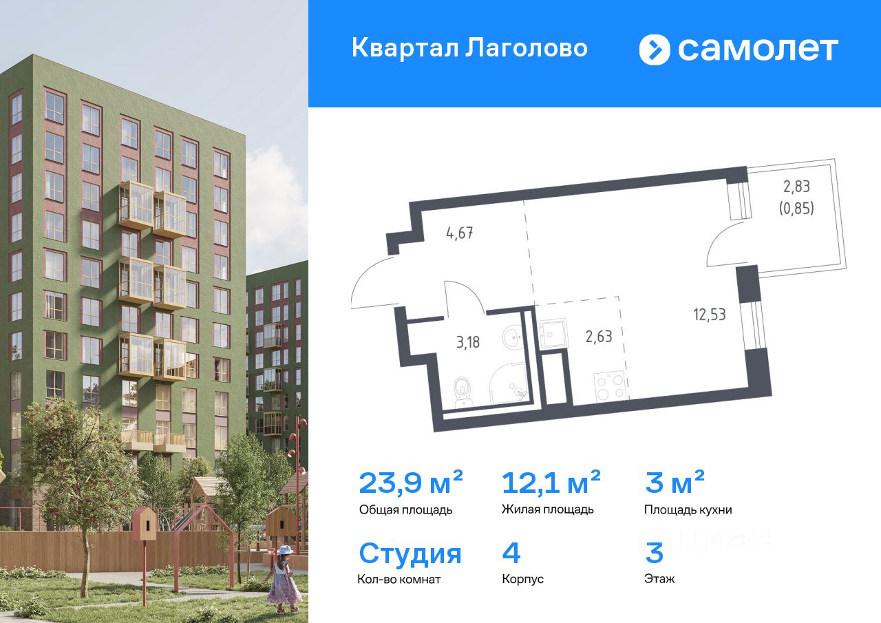 Предлагается квартира студия комфорт-класса 23,86 кв.м в корпусе 4 на 3 этаже, в ЖК ''Квартал Лаголово'' Квартира с предчистовой отделкой. Доступность дополнительных опций уточняйте у застройщика.