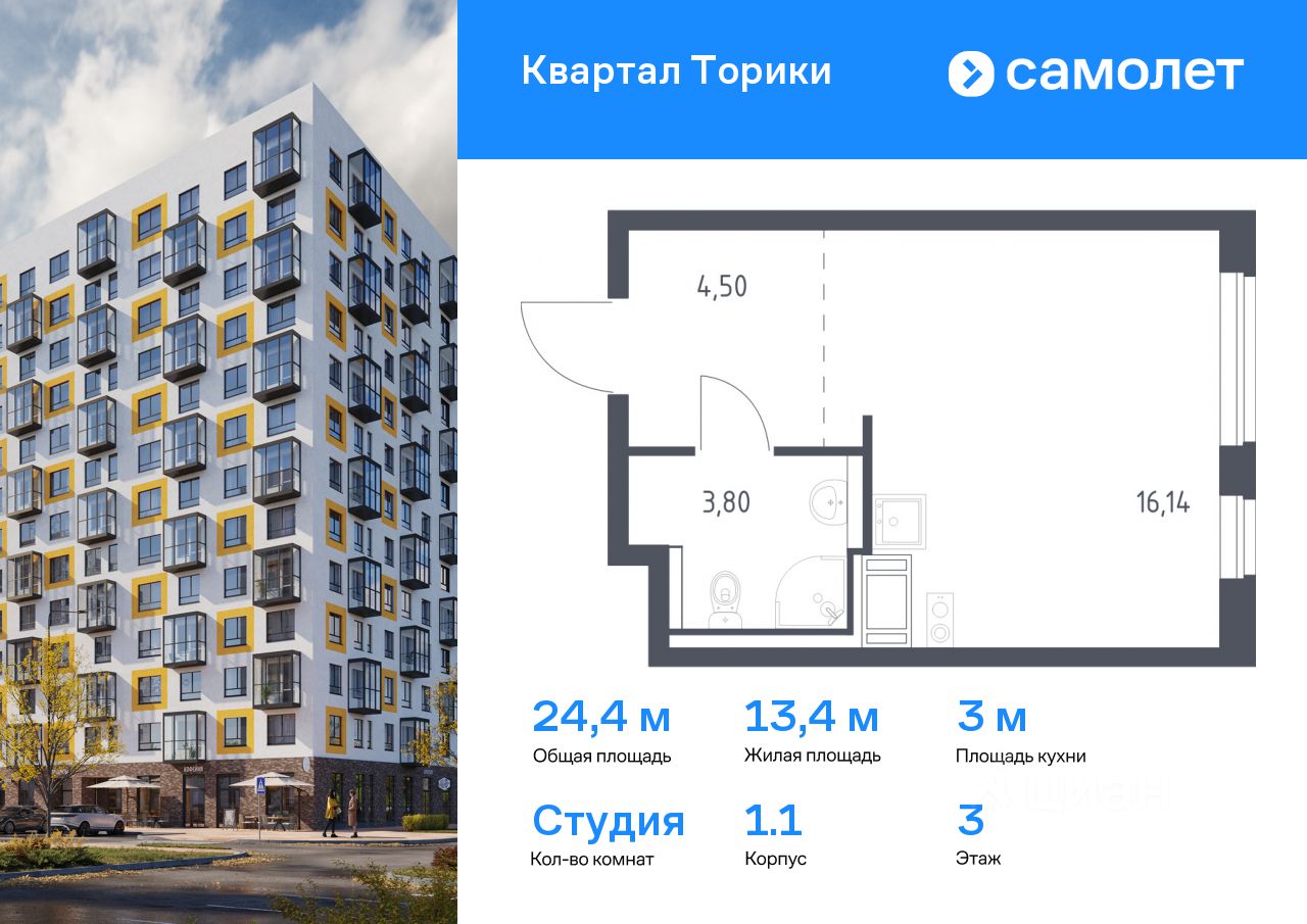 Предлагается квартира студия комфорт-класса 24,44 кв.м в корпусе 1.1 на 3 этаже, в ЖК ''Квартал Торики'' Квартира с предчистовой отделкой. Доступность дополнительных опций уточняйте у застройщика.