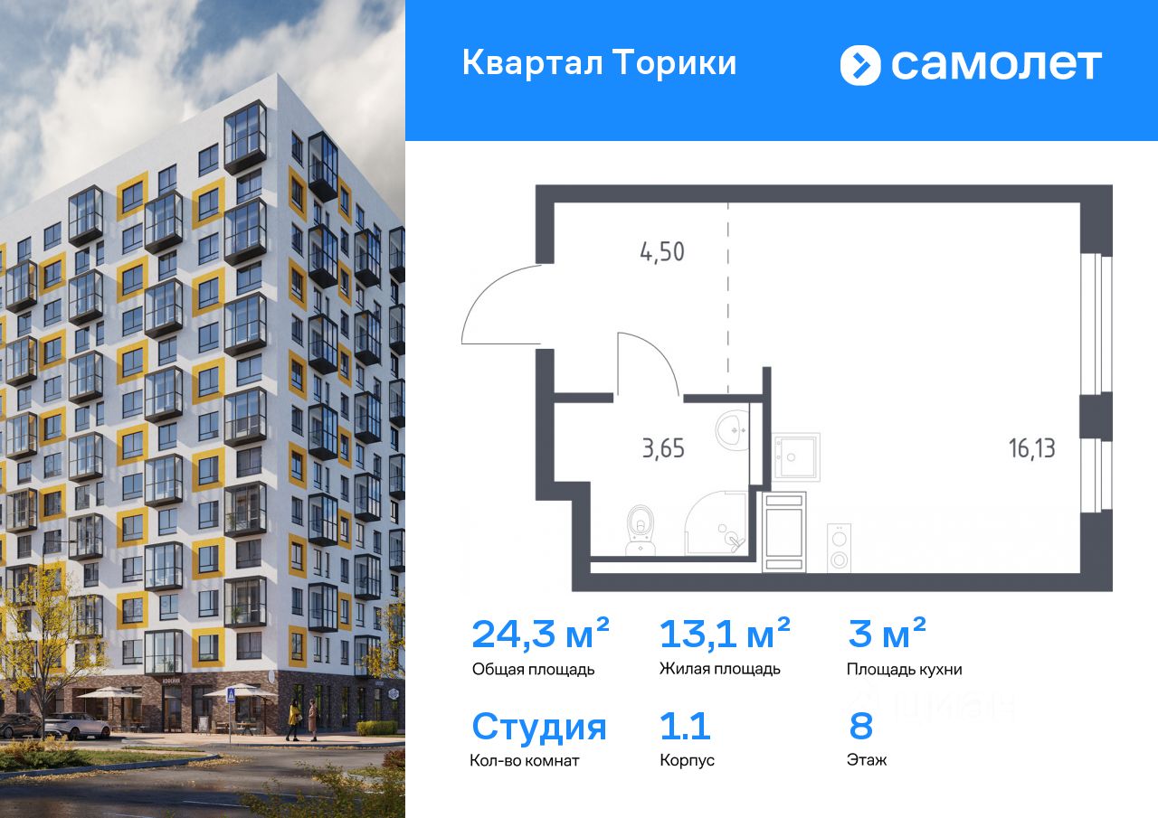 Предлагается квартира студия комфорт-класса 24,28 кв.м в корпусе 1.1 на 8 этаже, в ЖК ''Квартал Торики'' Квартира с чистовой отделкой. Доступность дополнительных опций уточняйте у застройщика.