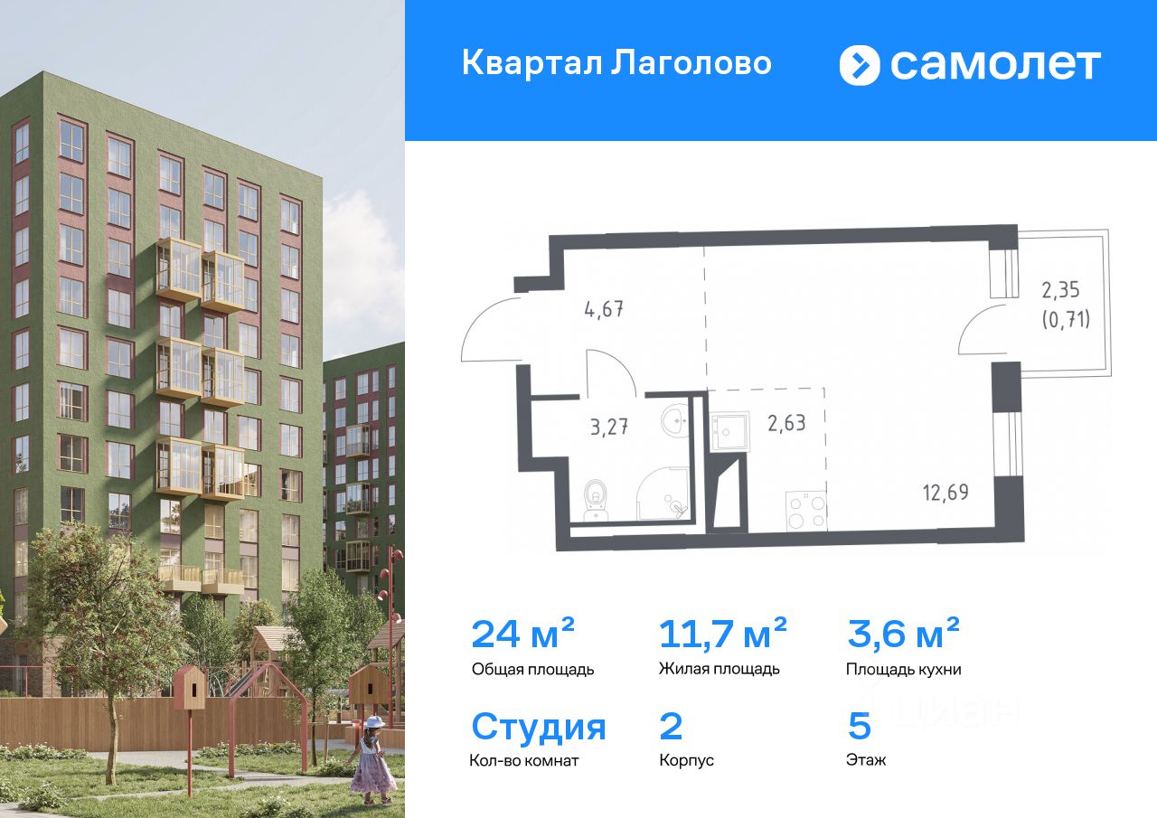 Строим кварталы для жизни с заботой о будущем. Предлагается квартира студия комфорт-класса 23,97 кв.м в корпусе 2 на 5 этаже, в ЖК ''Квартал Лаголово'' Квартира с чистовой отделкой. Доступность дополнительных опций уточняйте у застройщика.