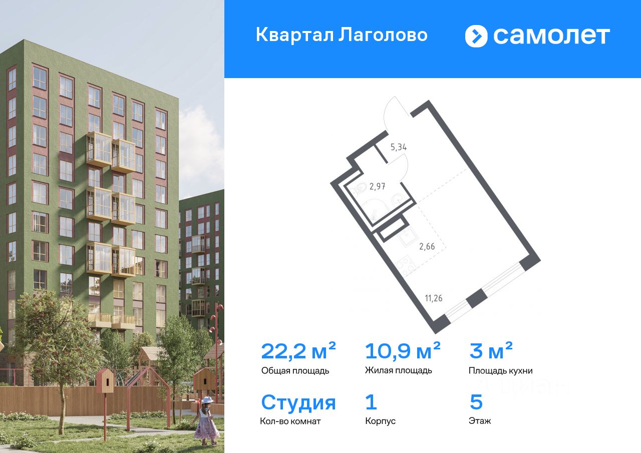 Предлагается квартира студия комфорт-класса 22,23 кв.м в корпусе 1 на 5 этаже, в ЖК ''Квартал Лаголово'' Квартира с предчистовой отделкой. Доступность дополнительных опций уточняйте у застройщика.
