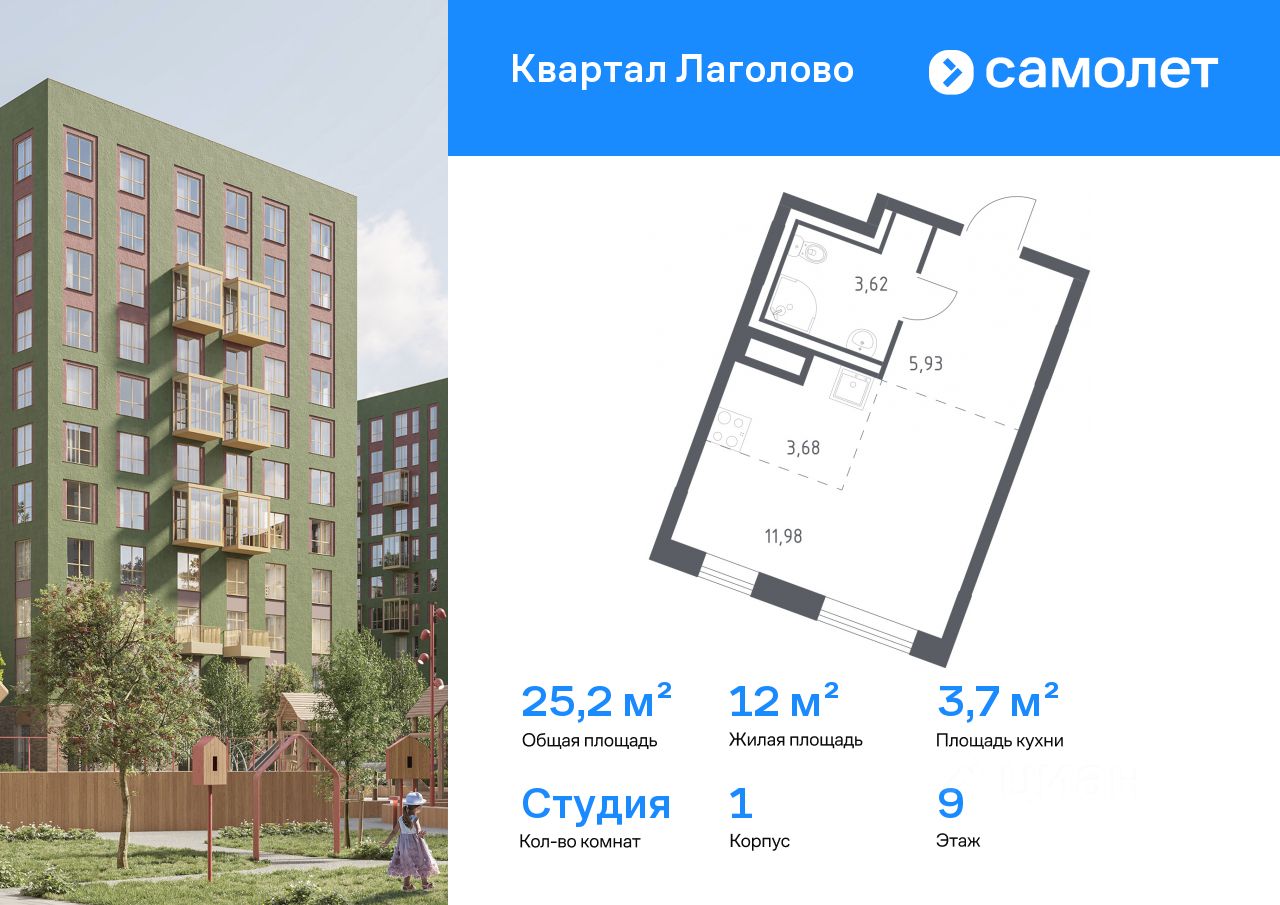 Предлагается квартира студия комфорт-класса 25,21 кв.м в корпусе 1 на 9 этаже, в ЖК ''Квартал Лаголово'' Квартира с предчистовой отделкой. Доступность дополнительных опций уточняйте у застройщика.