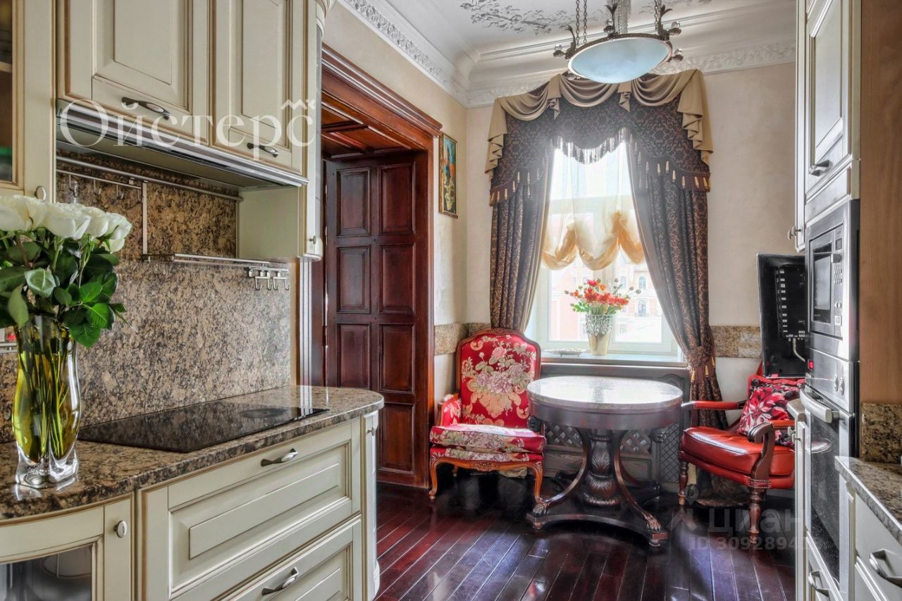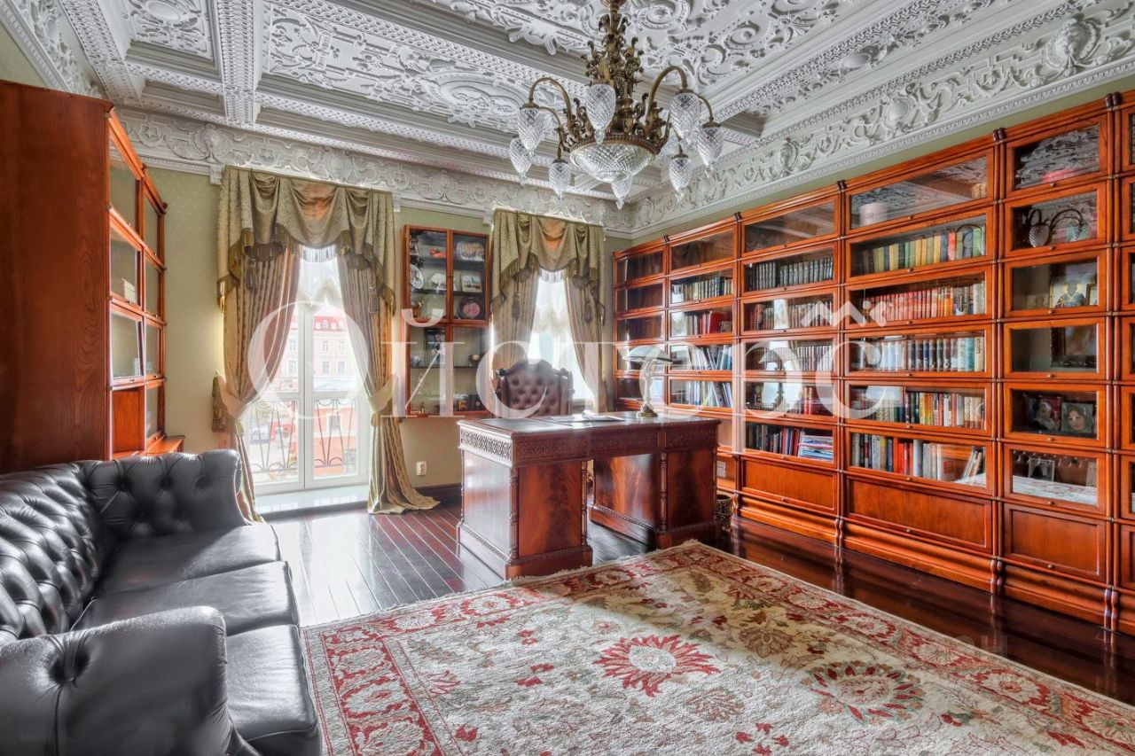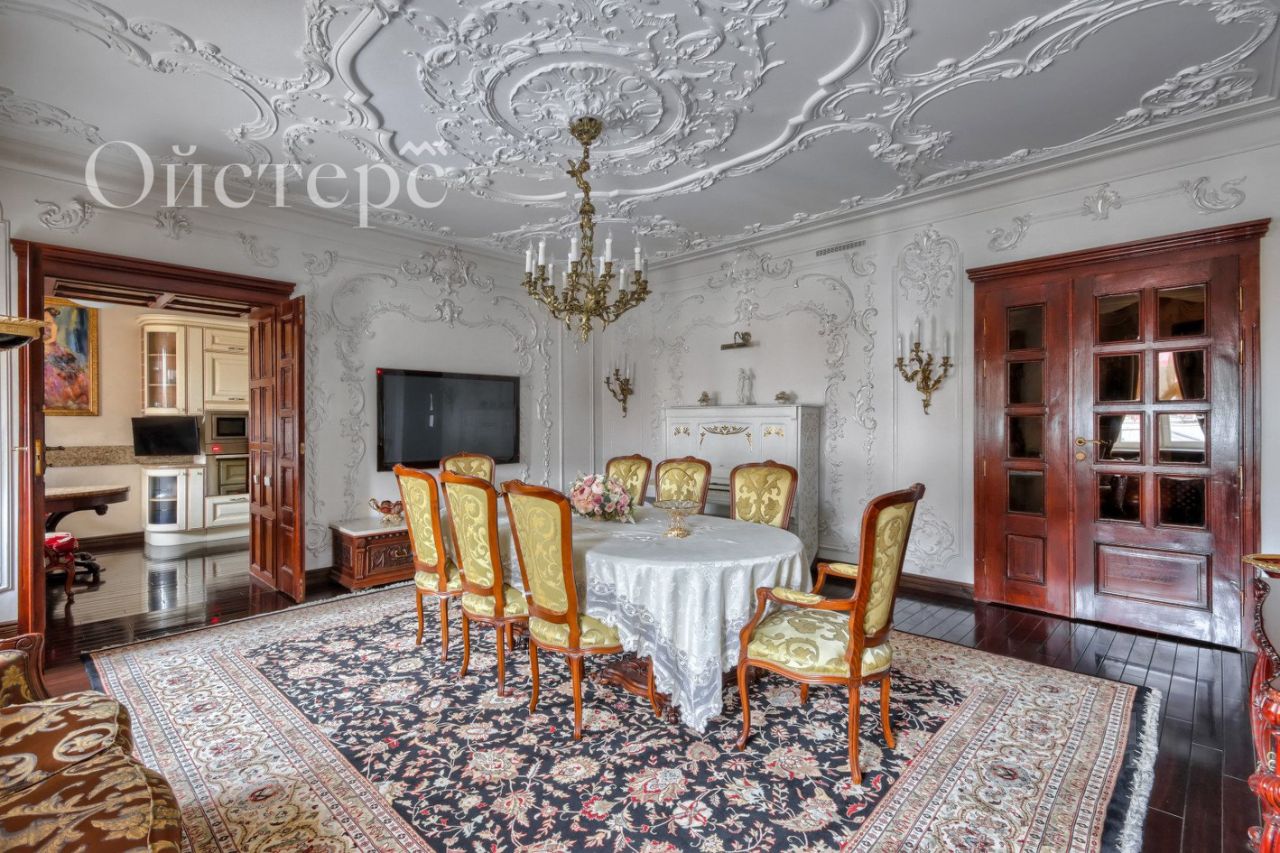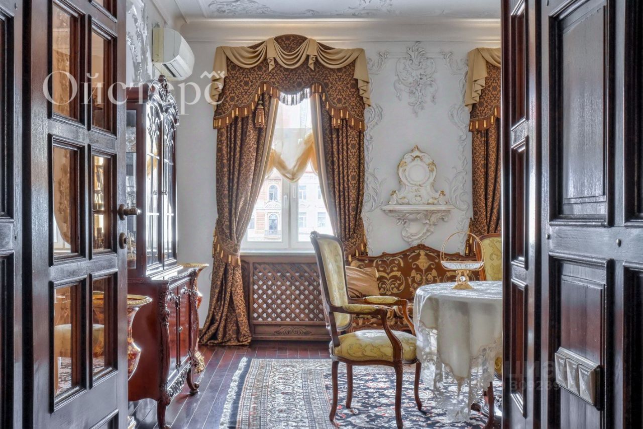 Квартира в самом центре Петербурга: Площадь 219 м². Высота потолков 3.11 метра. Интерьер оформлен с чутким вниманием к деталям: изысканная лепнина, натуральный камень и мрамор, двери и дверные порталы из массива дерева, паркет, уложенный цельным контуром без стыков.