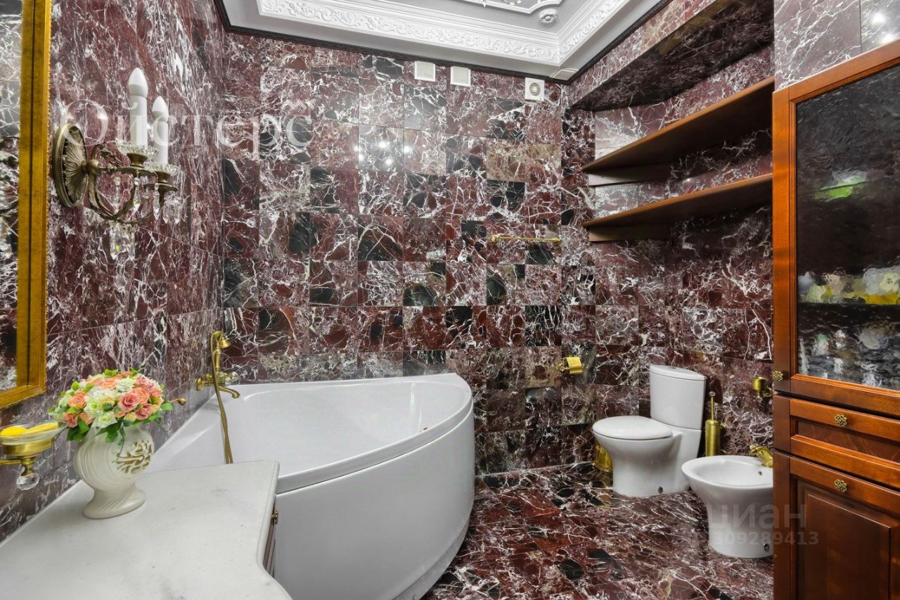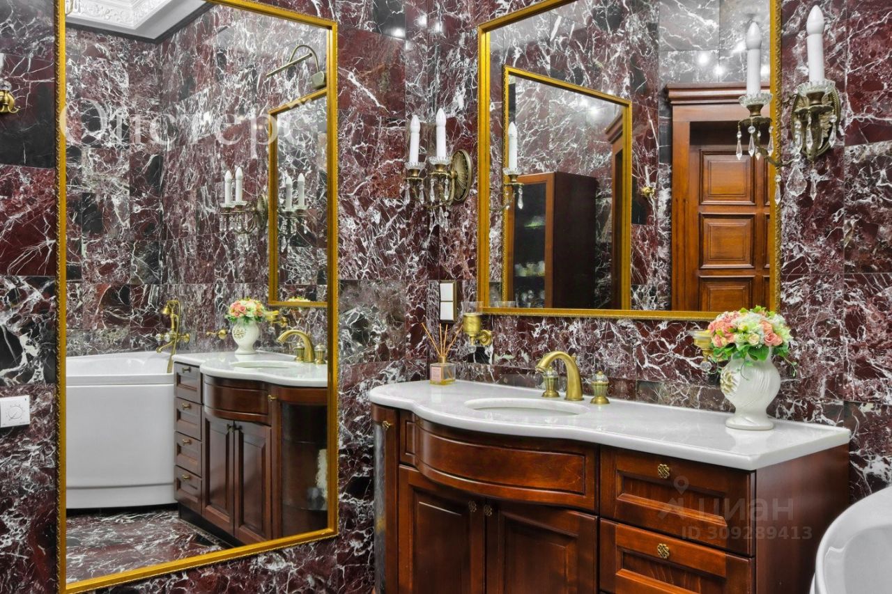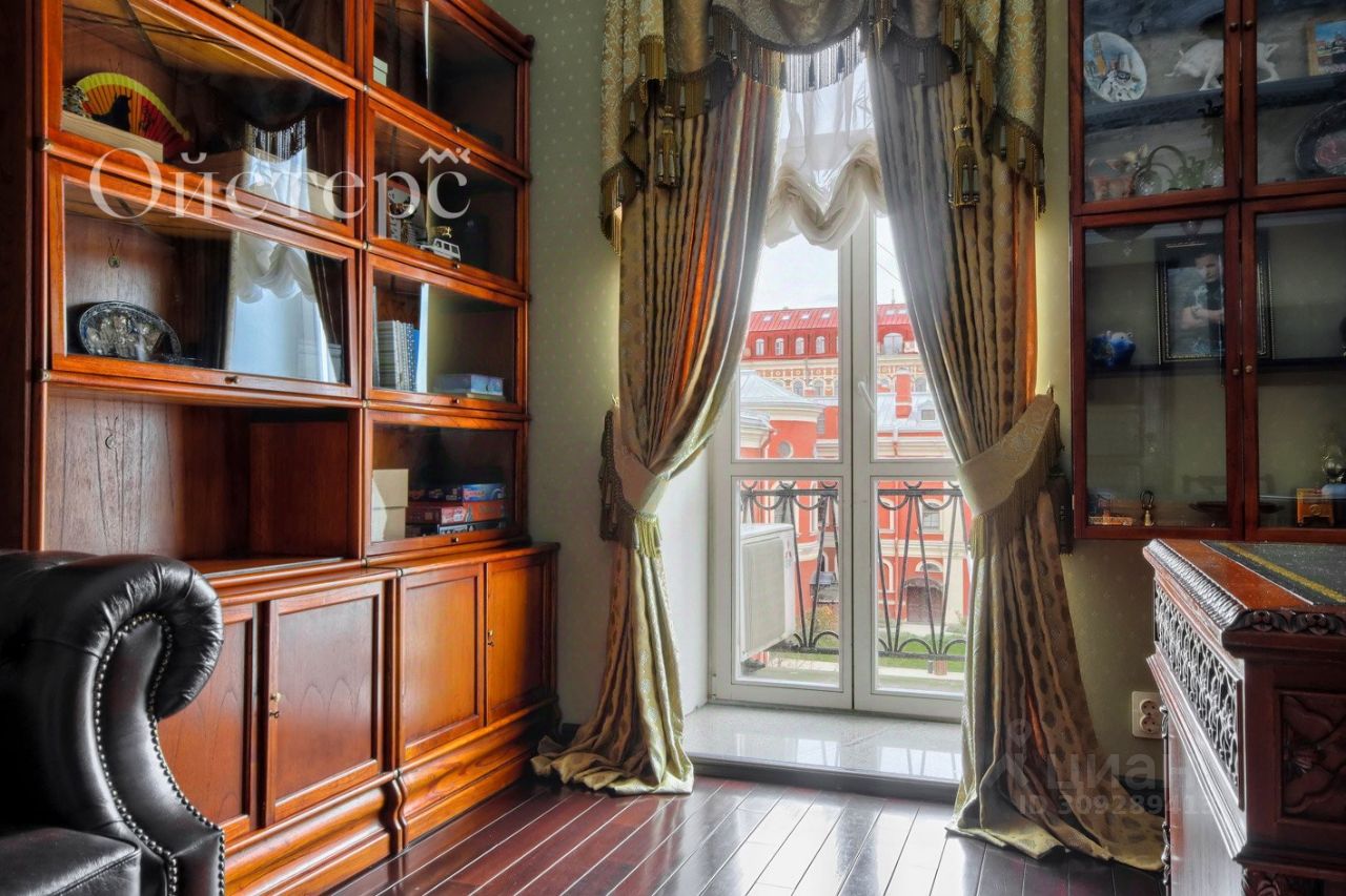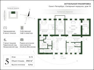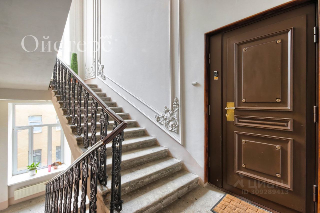 Квартира в самом центре Петербурга: Площадь 219 м². Высота потолков 3.11 метра. Интерьер оформлен с чутким вниманием к деталям: изысканная лепнина, натуральный камень и мрамор, двери и дверные порталы из массива дерева, паркет, уложенный цельным контуром без стыков.
